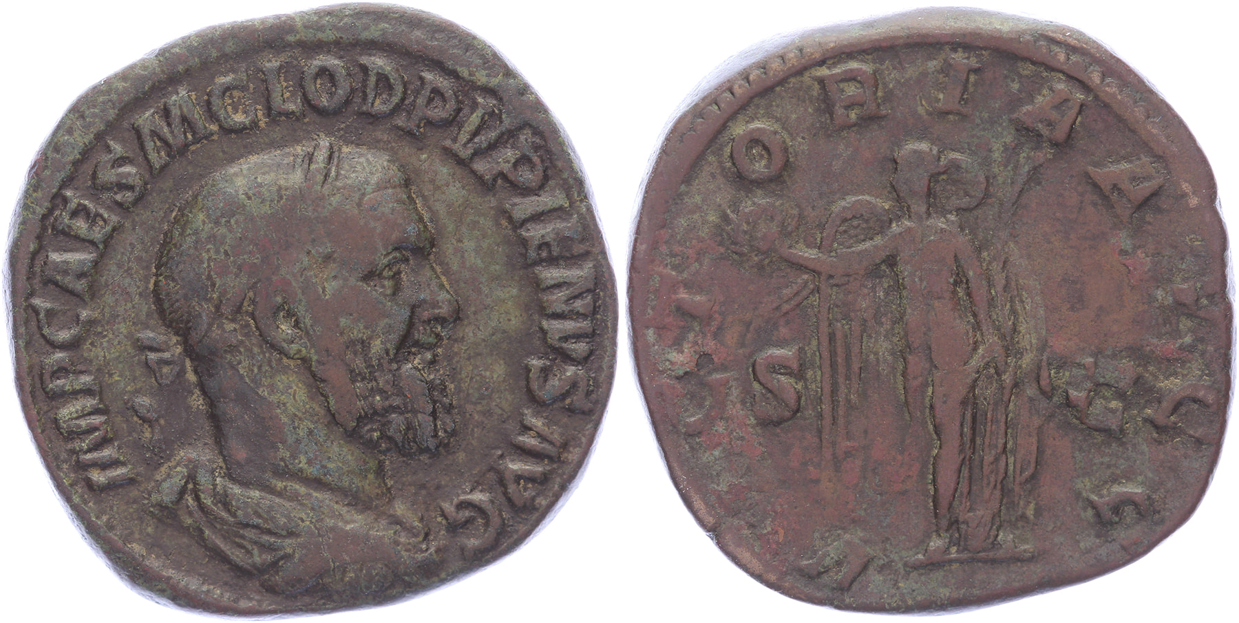 Æ Sestertius [25,39 gm, 31,8 mm]. Rome mint. Struck May-June 238 AD. IMP CAES M CLOD PVPIENVS AVG, laureate, draped, and cuirassed bust right, seen from behind / VICT ORIA AVGG, Victory standing facing, head left, holding wreath and palm branch; S-C across field. RIC IV 23a; Banti 12. aVF.