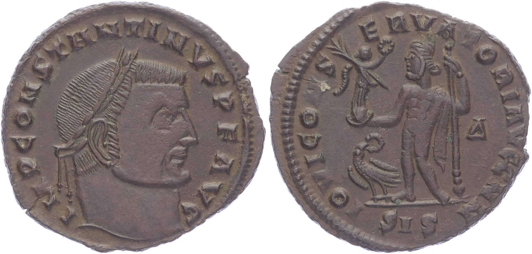Æ Follis [3,40 gm, 23,35 mm]. Siscia mint. Struck 313 AD. IMP CONSTANTINVS P F AVG, laureate head to right / IOVI CON-SERVATORI / Δ, Jupiter standing front, head to left, holding Victory on globe in his right hand and long scepter in his left; at his feet, eagle to left, holding wreath in beak; SIS in exergue. RIC 231b. EF.
