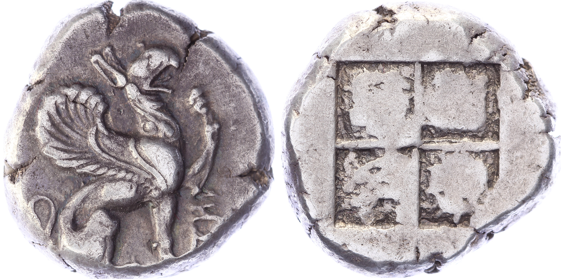 Circa 478-449 BC. AR Stater [11,86 gm, 19,1 mm]. Griffin seated right with left foreleg raised; below foreleg, THI / Quadripartite incuse square. Balcer, The Early Silver Coinage of Teos, SNR 47, 1968, Nr .9. Toned gVF.Purchased from Gijs Henzen, February 1998 (The Hague Holland Coin Fair)