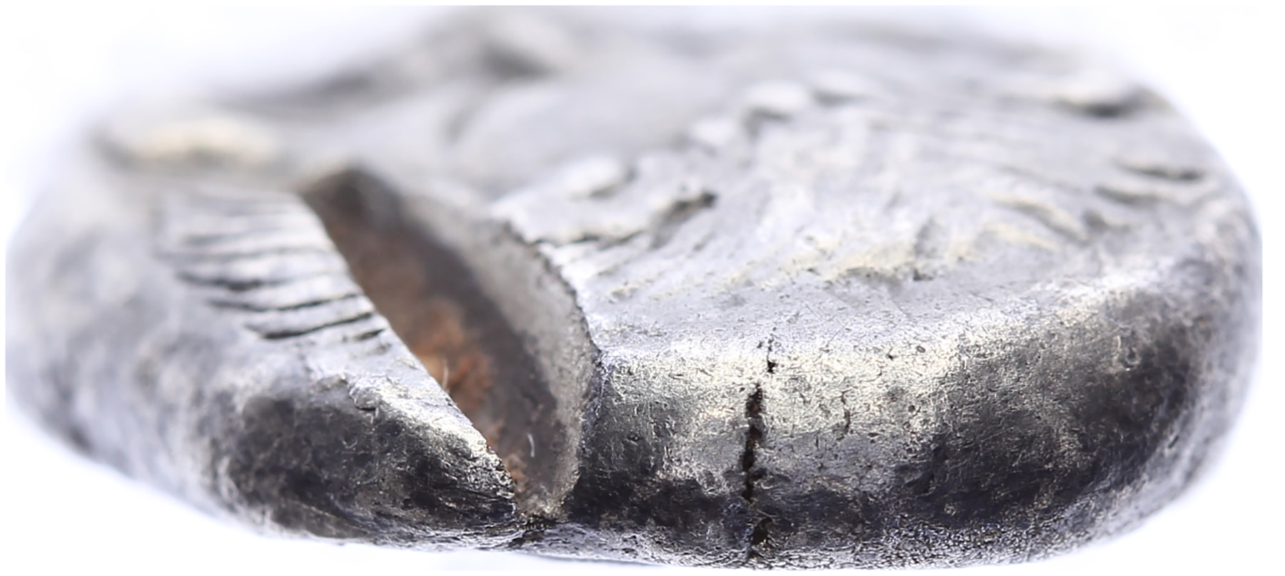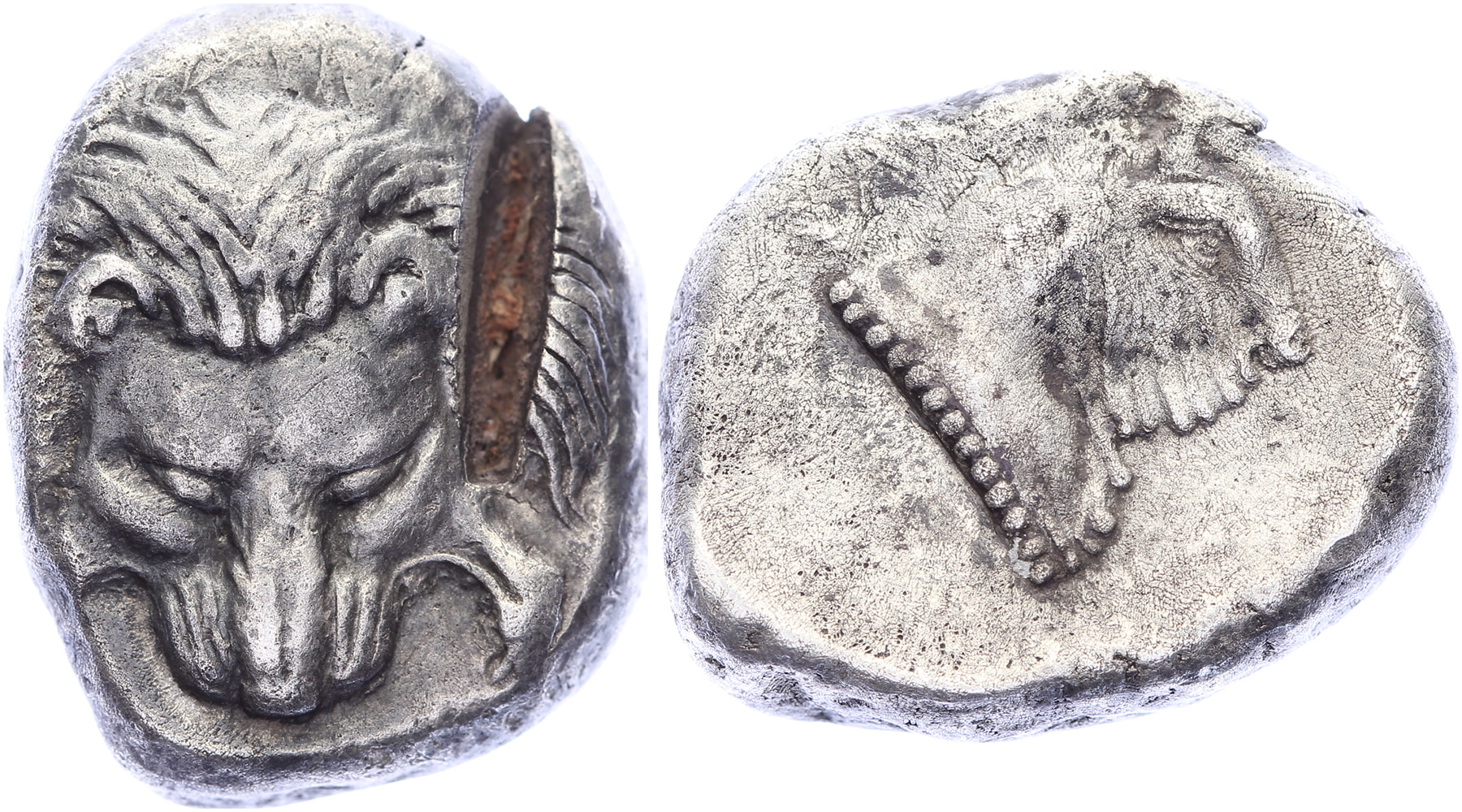 485-439 BC. AR Tetradrachm [12,89 gm, 16,8 mm]. Samian standard. Facing lion’s scalp / ΣA, forepart of bull right. SNG Copenhagen 1678; SNG von Aulock 2289; SNG Lockett 2871; Pozzi 2551. Test cut on the obverse, VF.Purchased from André Cichos, August 2018 (through MA Shops)