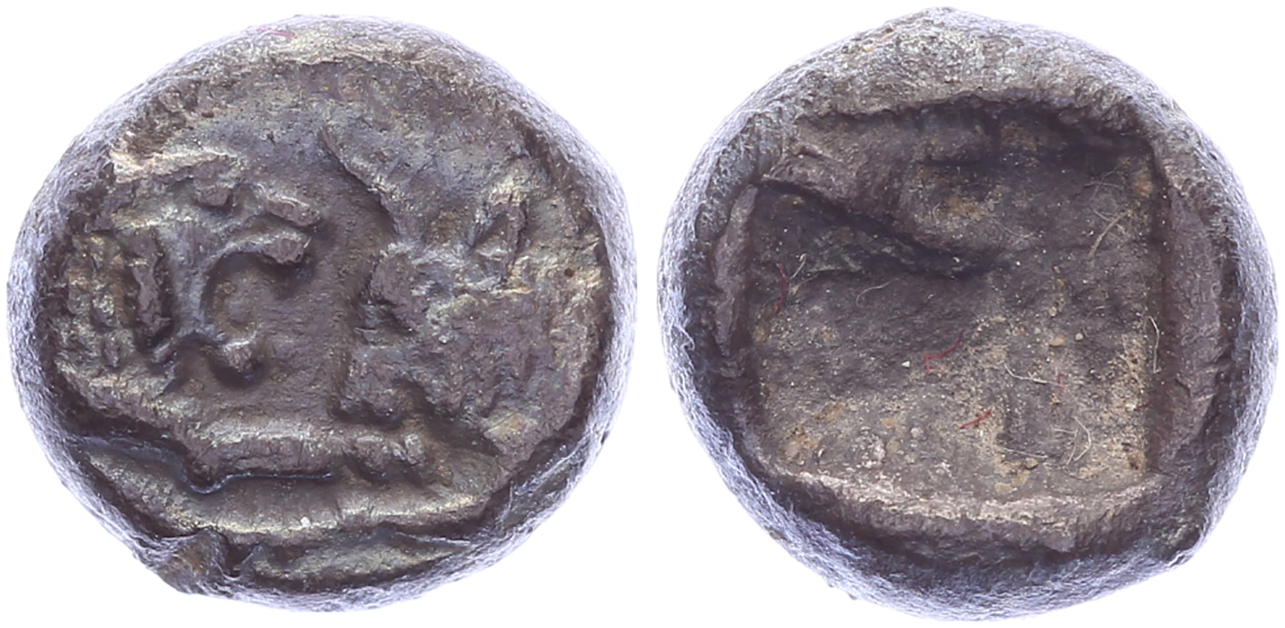 AR Twelfth Stater [0,79 gm, 7,9 mm]. Sardeis mint. Confronted foreparts of a lion and a bull / Incuse square. Berk 26-7; Kurth S8; SNG Ashmolean 775. Darkly toned VF.Purchased from Tom Vossen, June 2004
