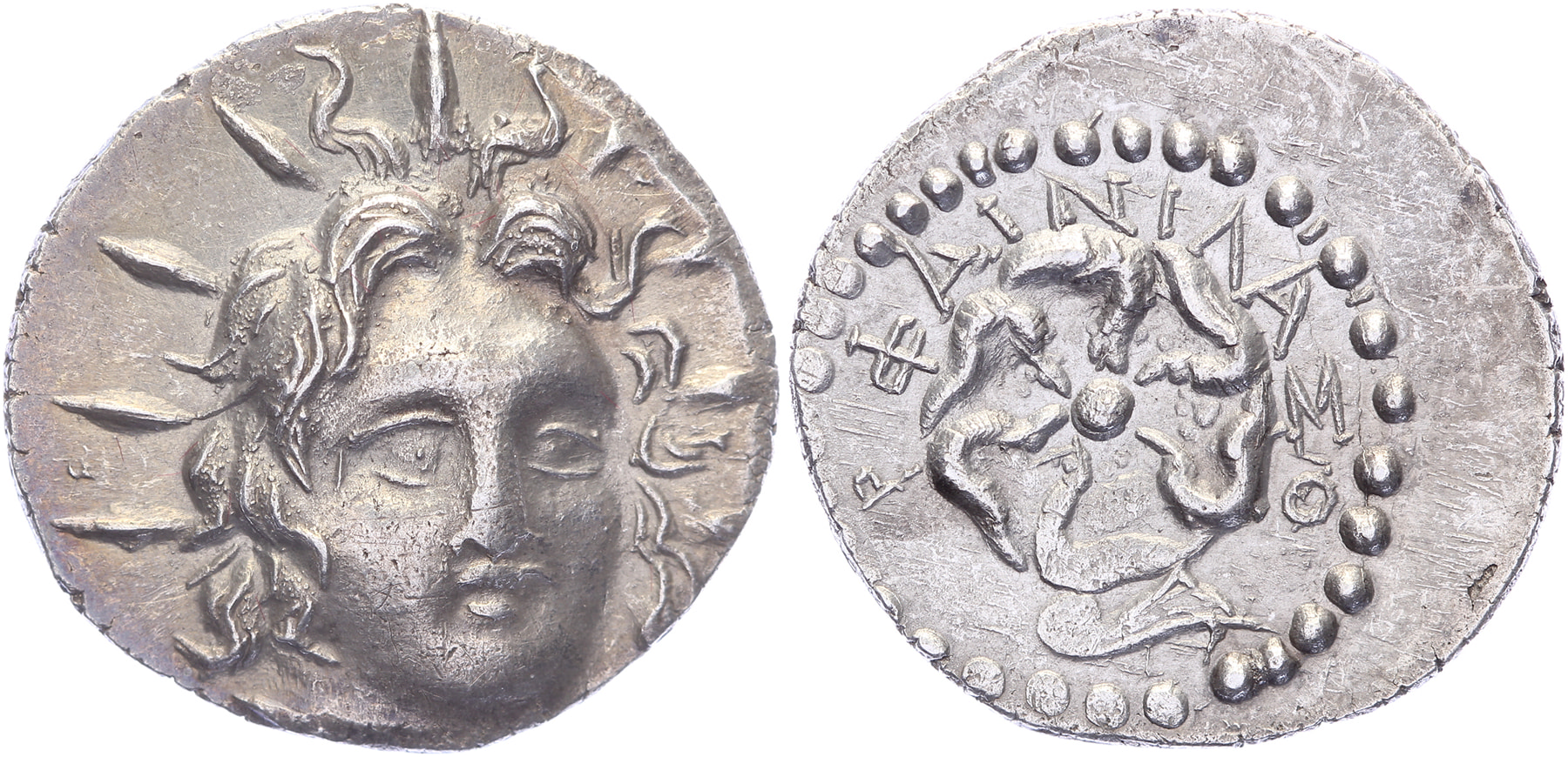 Circa 40 BC-25 AD. AR Drachm [4,08 gm, 20,8 mm]. Phainilas, magistrate. Radiate head of Helios facing slightly right / Open rose; acrostolion below, ΦAINIΛAΣ around. Ashton & Weiss, “The Post-Plinthophoric Silver Drachms of Rhodes,” NumChron 1997, 313. Minor die rust, EF. Purchased from H.D. Rauch, mei 2004, Auction 73 lot 308