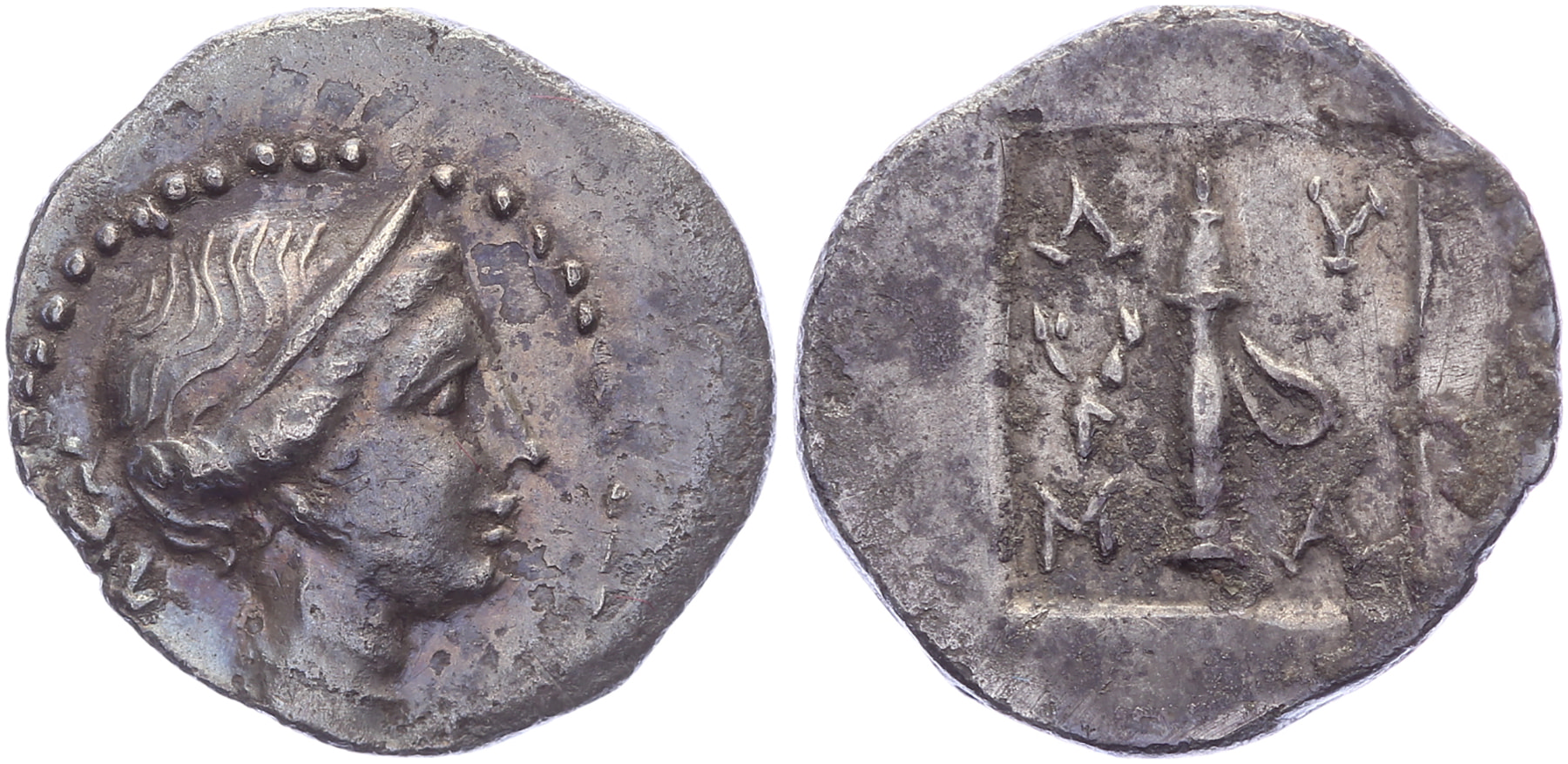 1st century BC. AR Quarter Drachm [0,96 gm, 12,9 mm]. Bust of Artemis right, wearing stephane; bow and quiver behind shoulder / Quiver with strap; L - Y / Y / M - A across fields; all within shallow incuse square. Troxell 139. Minor areas of roughness, toned VF.Purchased from Tom Vossen, June 2004