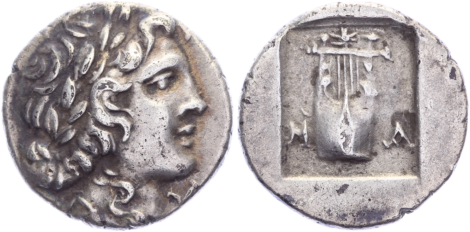 Circa 40-35 BC. AR Hemidrachm [1,82 gm, 13,6 mm]. Λ-Y Laureate head of Apollo to right / M-A Kithara with three strings; above, star. RPC I 3301; Troxell, Lycian, 86. Toned nice VF.Purchased from MPO - Huib Pelzer, December 2004 (Berkel Enschot coin fair)