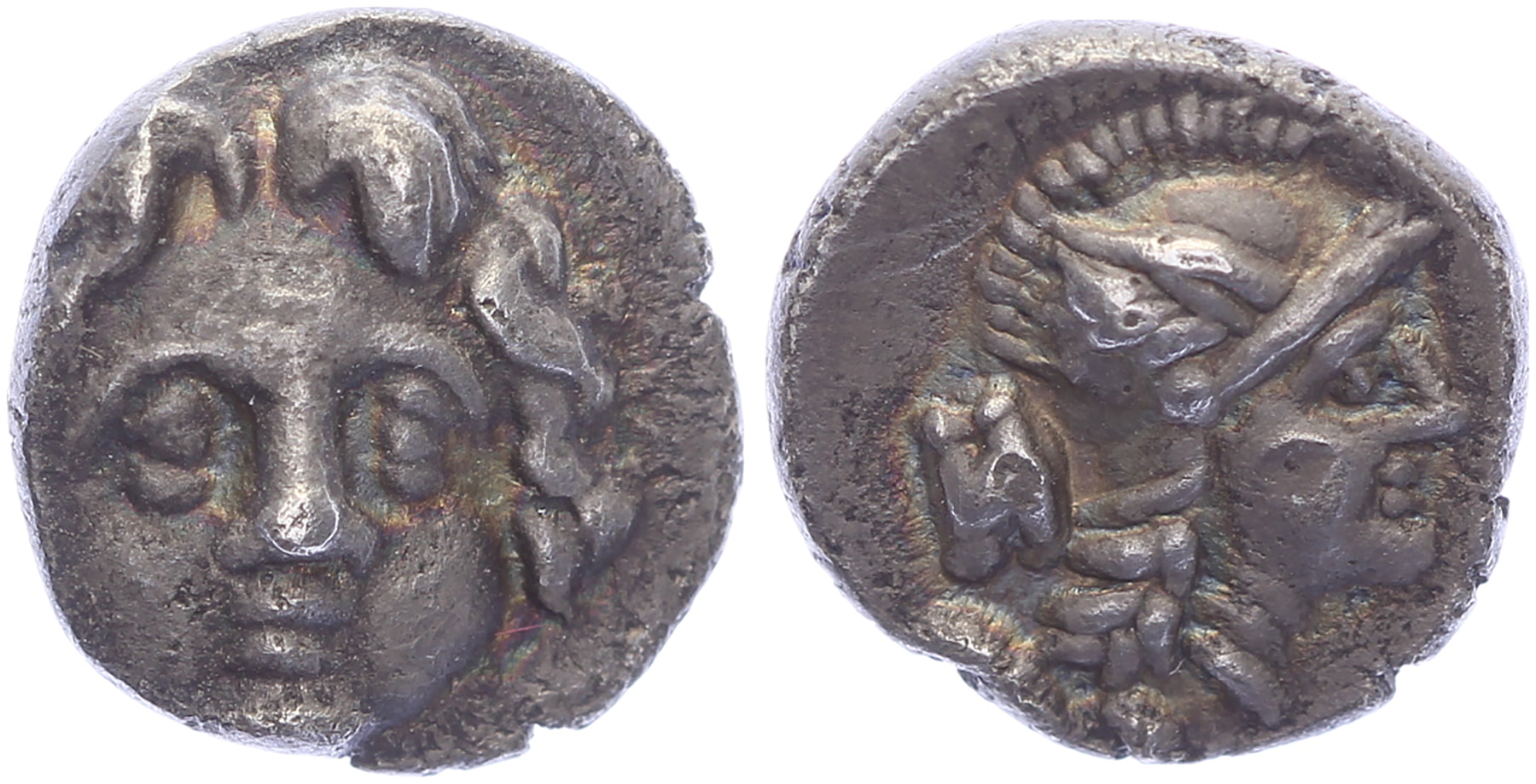 Circa 350-300 BC. AR Obol [0,96 gm, 9,2 mm]. Facing gorgoneion / Head of Athena to right, wearing crested Attic helmet; astragalos behind. SNG BN Paris 1932; SNG von Aulock 5278; BMC 8; SNG Ashmolean 1546–50. Toned gVF.