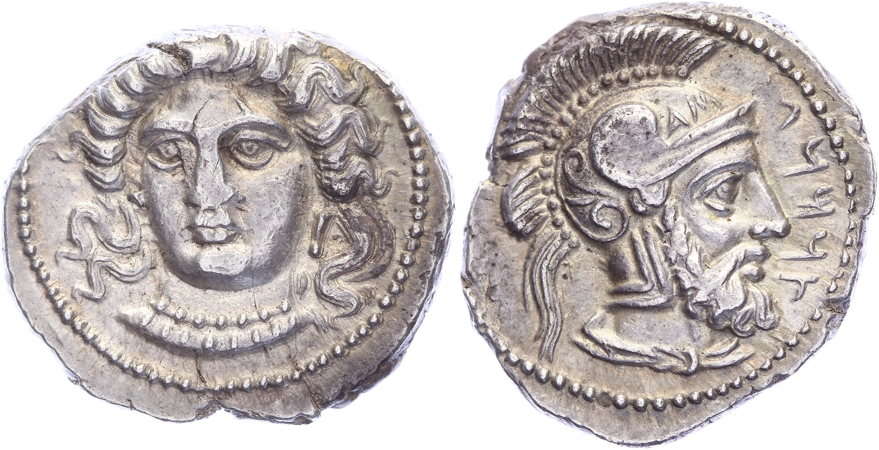 Tarkumuwa (Datames). Satrap of Cilicia and Cappadocia, 384-361/0 BC. AR Stater [10,85 gm, 23 mm]. Diademed female head facing slightly to left, wearing pendant earrings and necklace / (‘trkmw’ in Aramaic), bearded head of Ares (?) to right, wearing crested Attic helmet; on the bowl, AM. SNG Copenhagen 278-9 var. (no letters on helmet); SNG Levante 79 var. (no letters on helmet); SNG Paris 258-270 var. (no letters on helmet); Leu Web Auc. 18, lot 1363 (same dies). Extremely rare with AM on the helmet. Obverse a bit weak at high points, otherwise EF and interesting.Purchased from Tom Vossen (Tienen coin fair)