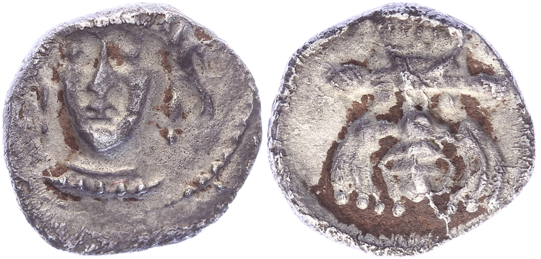 Uncertain mint. 4e eeuw BC. AR Obol [0,76 gm, 9 mm]. Head of female (Arethusa?) facing slightly left / Facing head of Bes. Göktürk 45; cf. SNG BN 486 (obol); SNG Levante 234. Obverse off cntre, toned aVF.Purchased from Tom Vossen, September 2002
