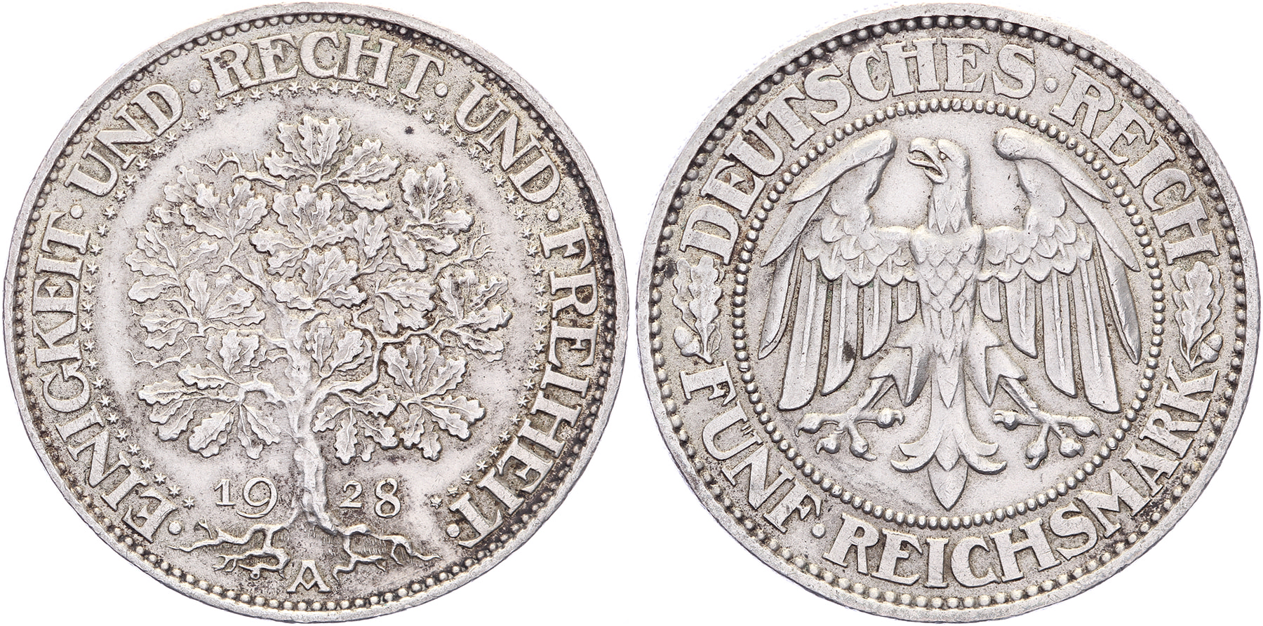5 Mark 1928A Eichbaum. KM 56; Jaeger 331. Gutes sehr schön.