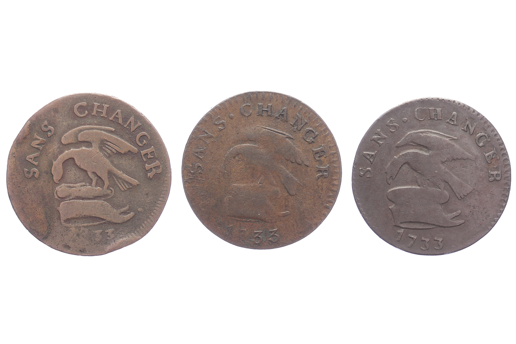 Lot (3) Penny 1733 with letter ‘J’ in all kind of positions. KM 5a-5c. Fine.
