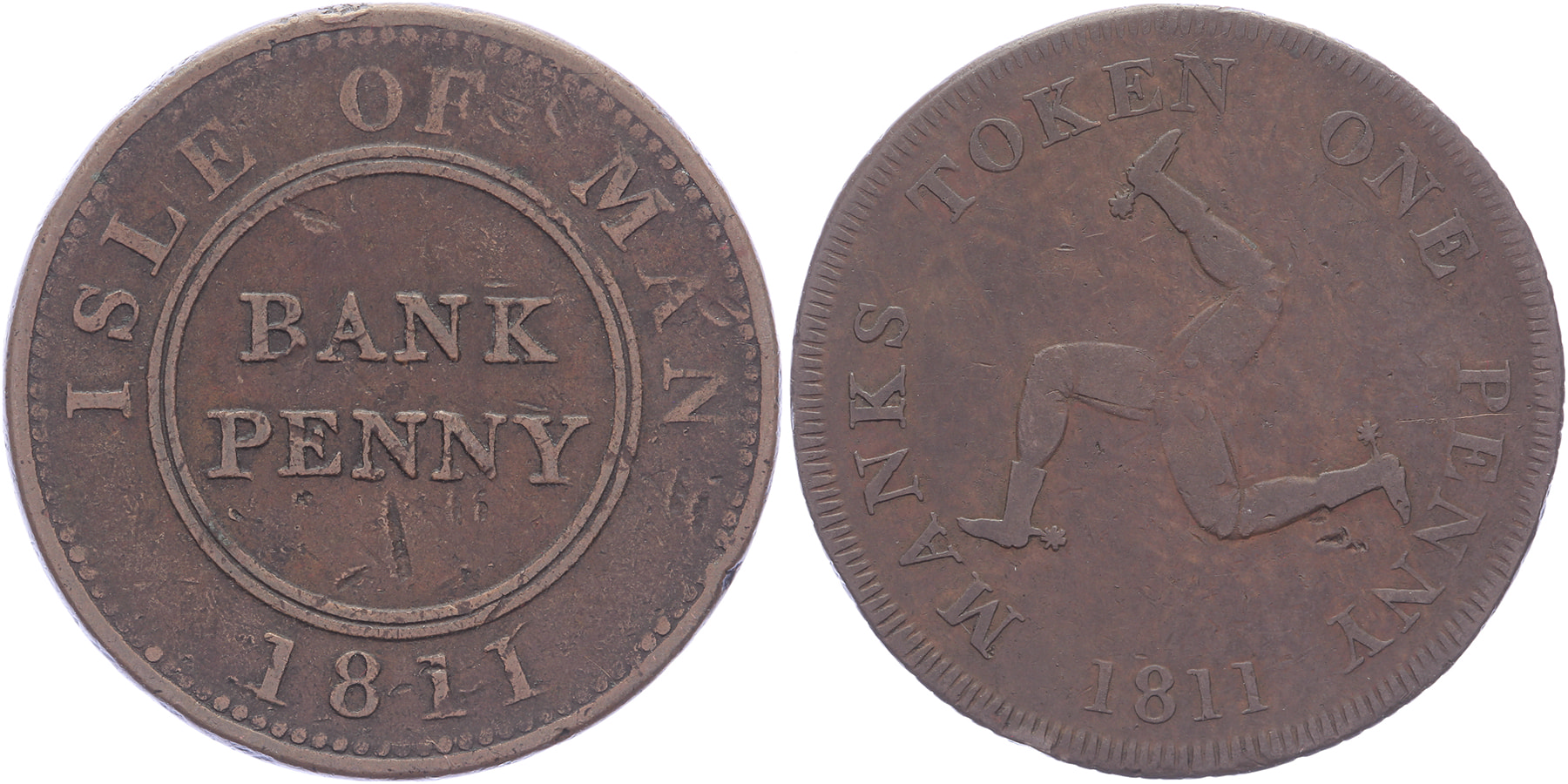 Lot (2) Bank Penny 1811; Manks Token one Penny. KM Tn10, Tn11. VF.
