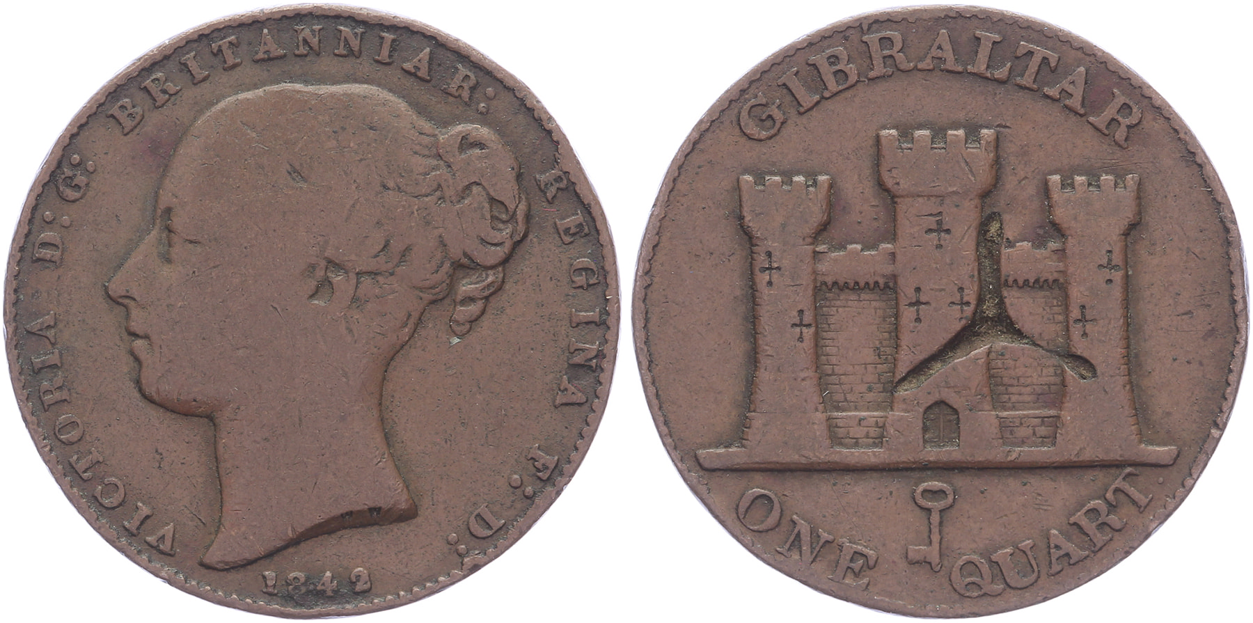 Gibraltar Quart 1842 countermarked with triskeles IOM. Fine.