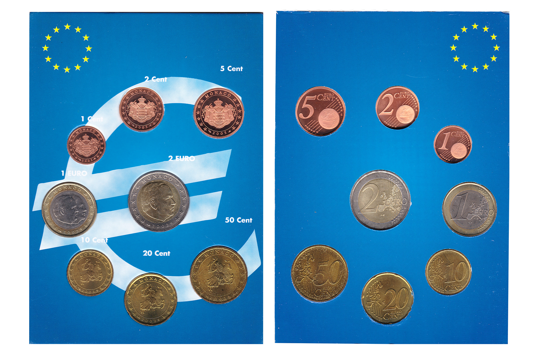 Leuchtturm set with 1, 2 & 5 eurocent 2005 in proof; the 10, 20 & 50 eurocent and 1, 2 euro 2002 UNC.