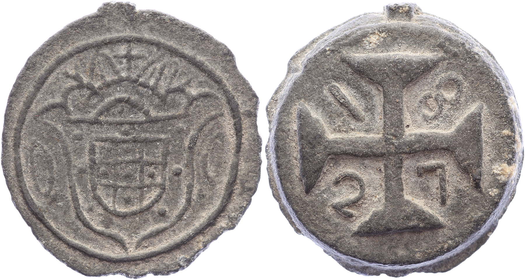 20 Bazarucos 1827, Diu. KM 58. Nice VF.