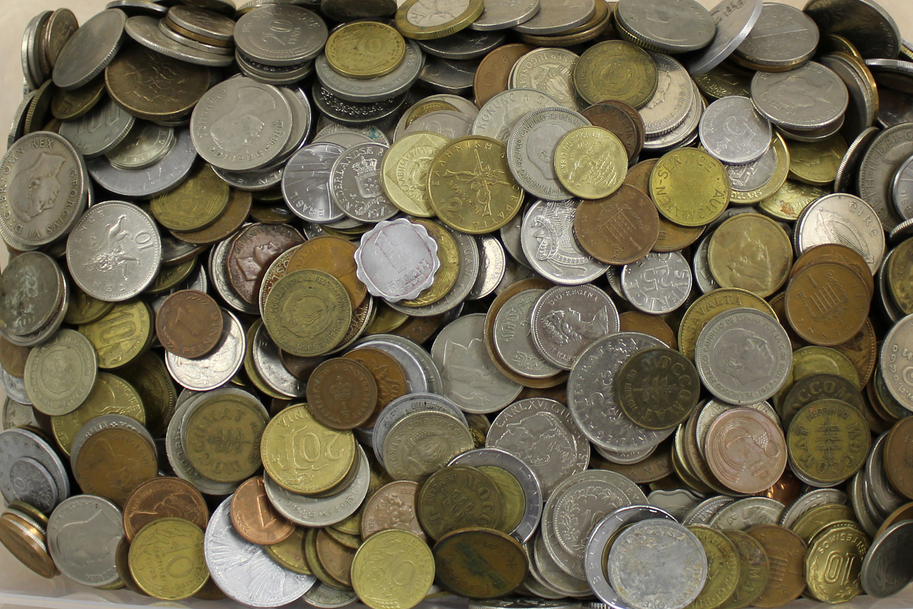 Plastic box eenvoudige wereldmunten, 10 kg., “kilowaar”.