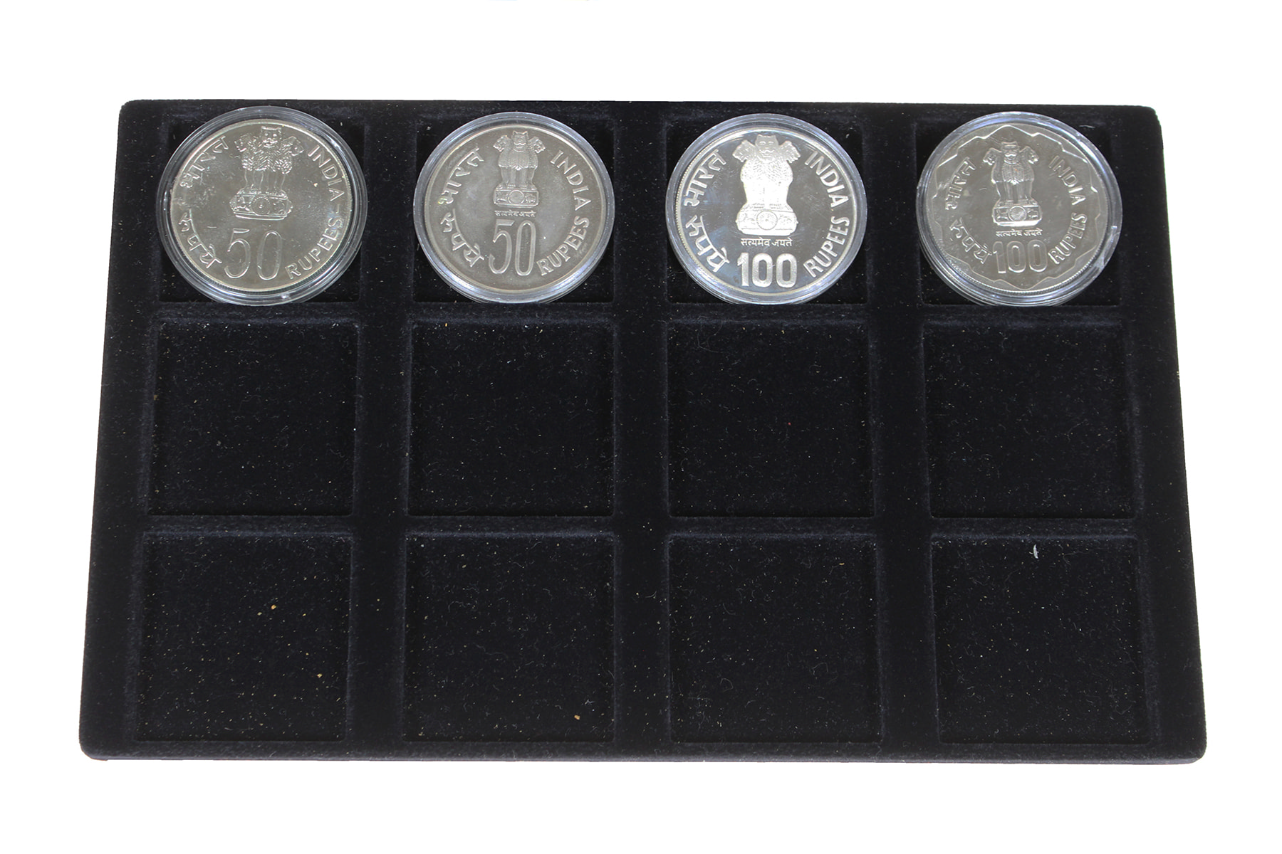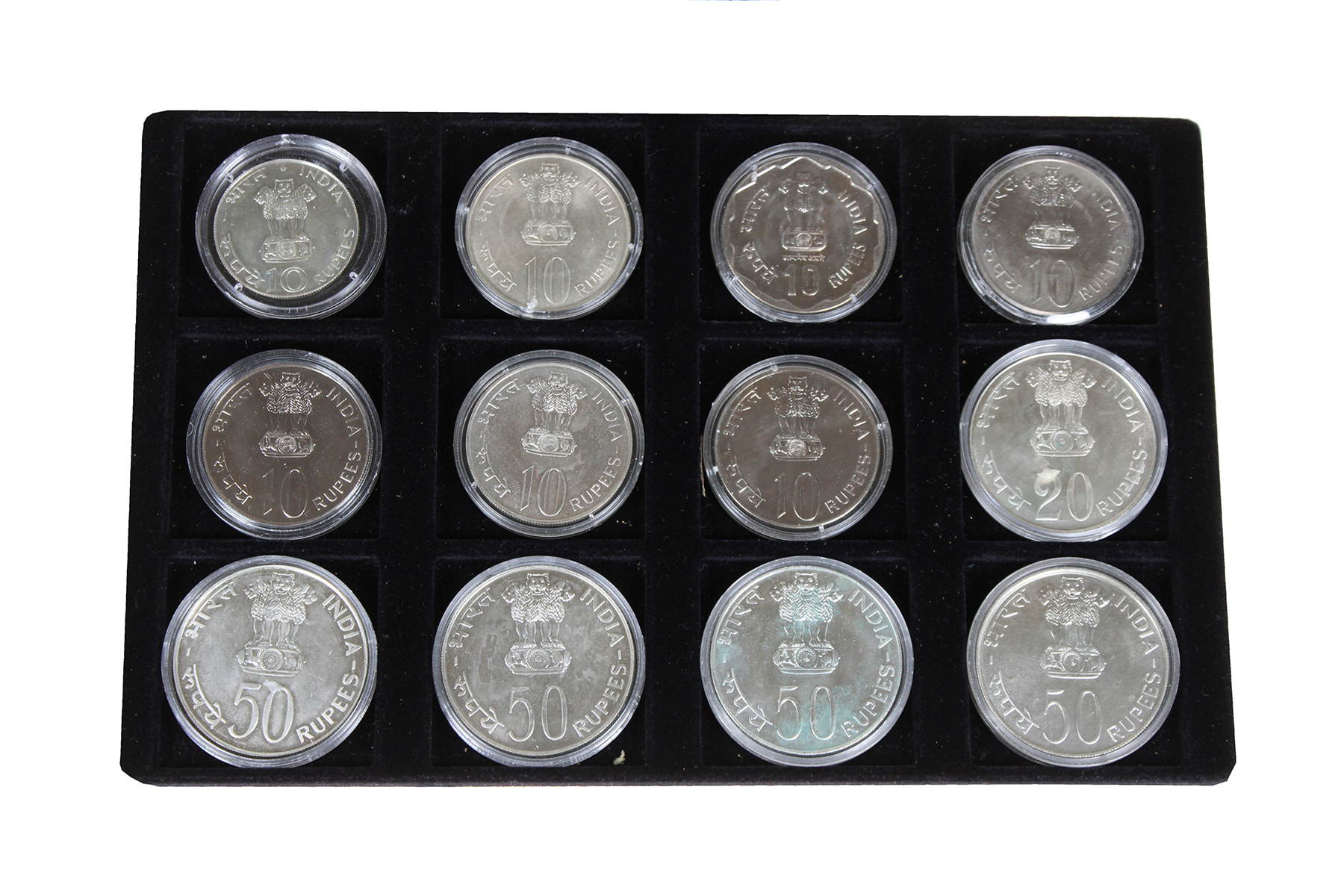 Lot (16) Zwarte cassette met India, 10 (7), 20 (1), 50 (6) en 100 Rupees (2). Prachtig tot proof.