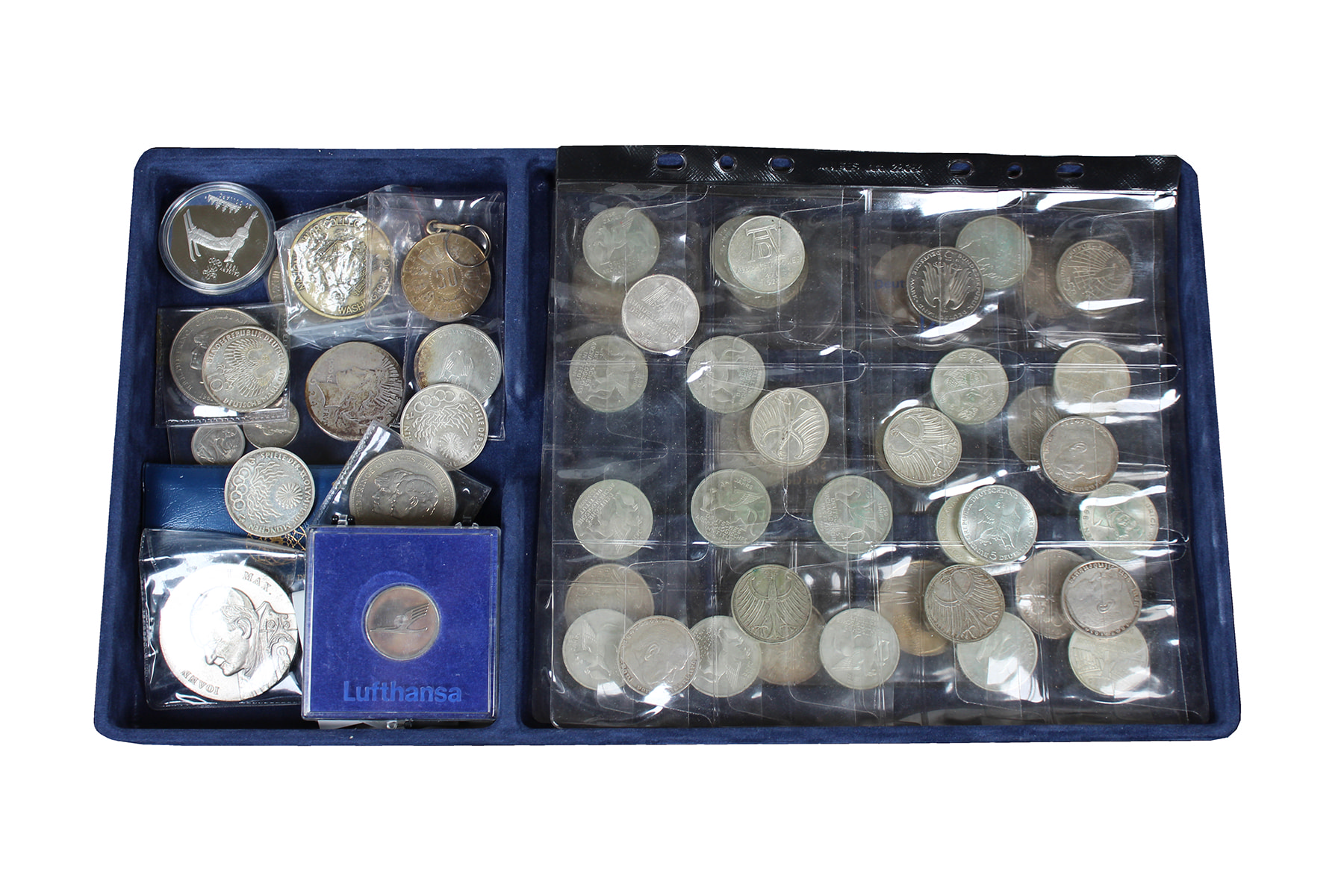 Blauwe cassette met voornamelijk zilveren 5 - 10 DM herdenkingsmunten.