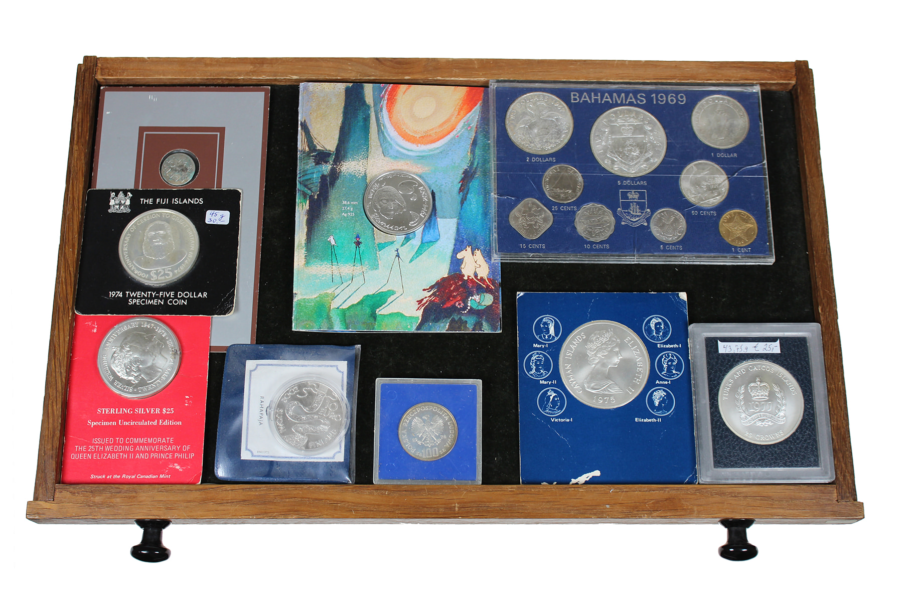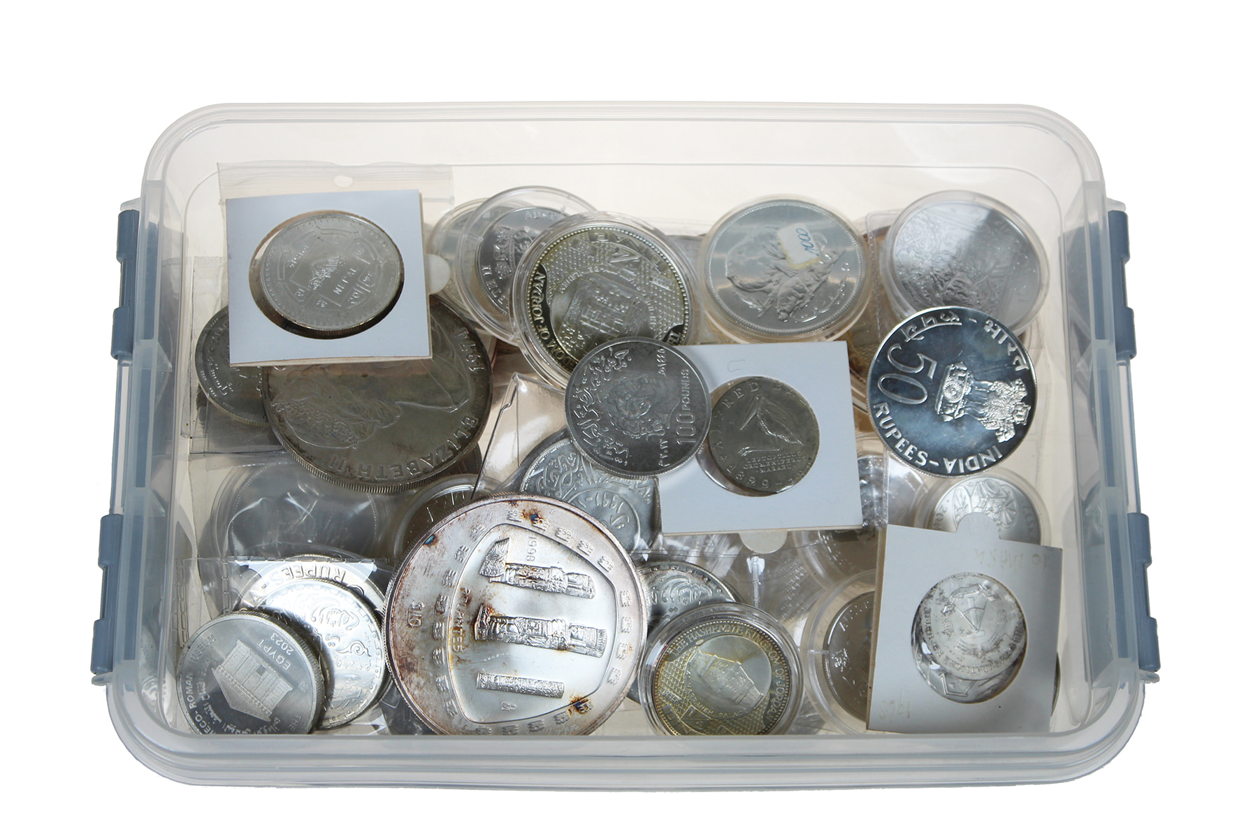 Kunststof box met ca. 75 zilveren munten from all over the world.
