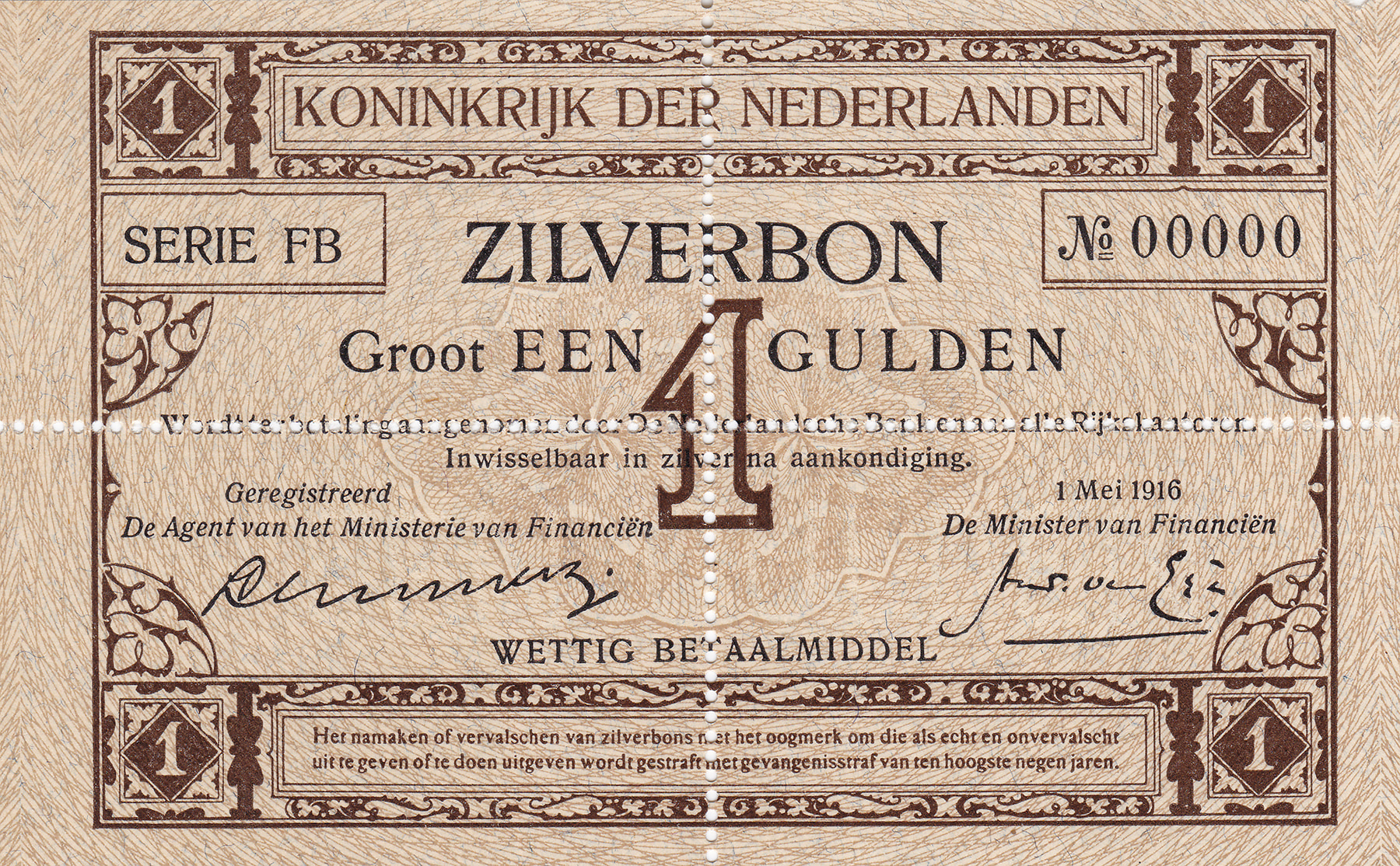 1 Gulden 1916 Zilverbon. Mev. -; PL 2.p1.d2 [# FB 00000]. Geperforeerd. Almost UNC.