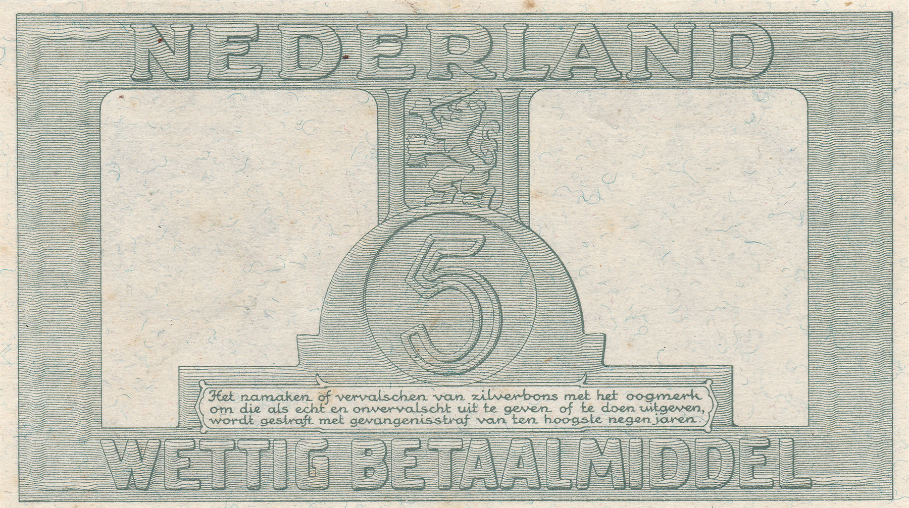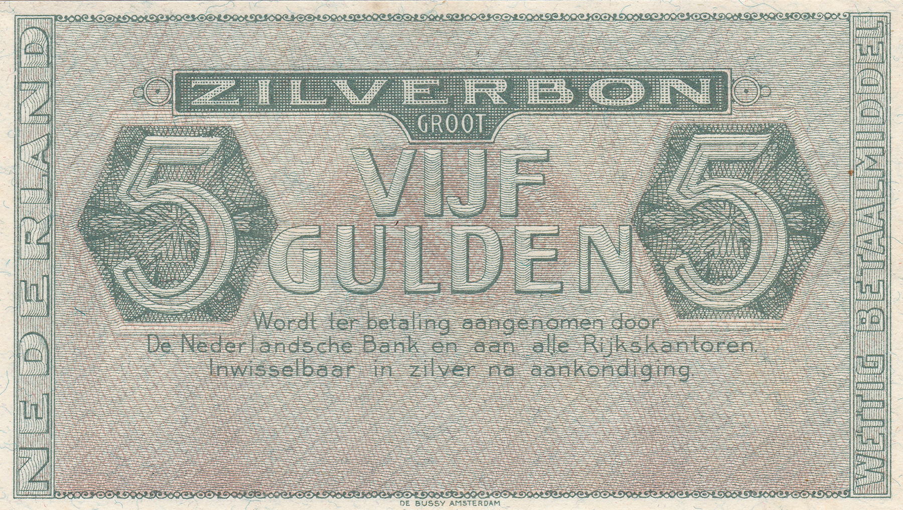 5 Gulden 1944 Zilverbon Proefdruk. Mev. 22-; PL 21.p. Zonder datum, handtekening etc. [# zonder serienummer]. Vrijwel UNC.