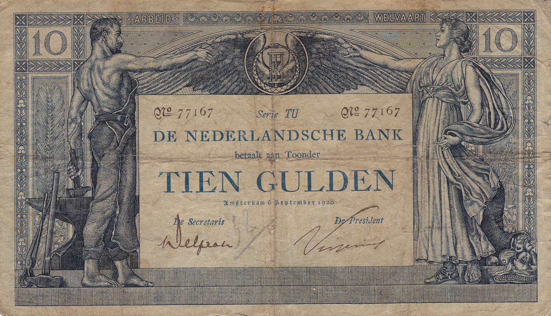 10 Gulden 1920 Arbeid en Welvaart. Mev. 36-4b; PL 31.e2b [# TU 77167]. Fraai.