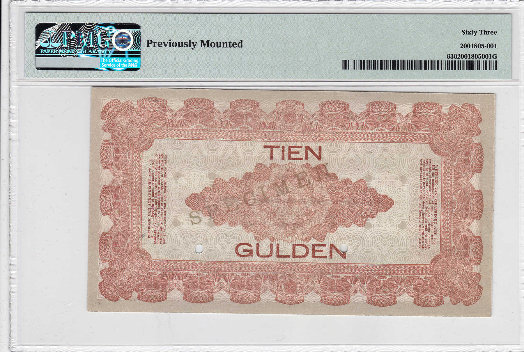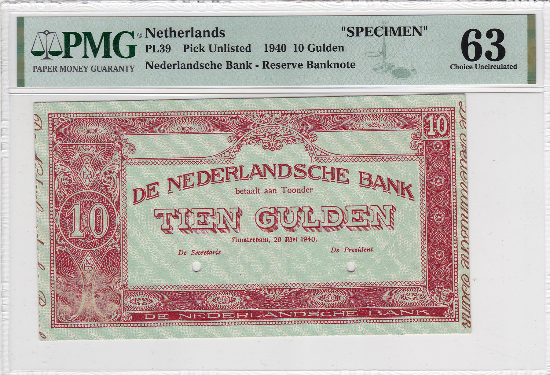 10 Gulden 1940 SPECIMEN. Mev. -; PL39.s. Geperforeerd. Graded by PMG (63). Previously mounted.
