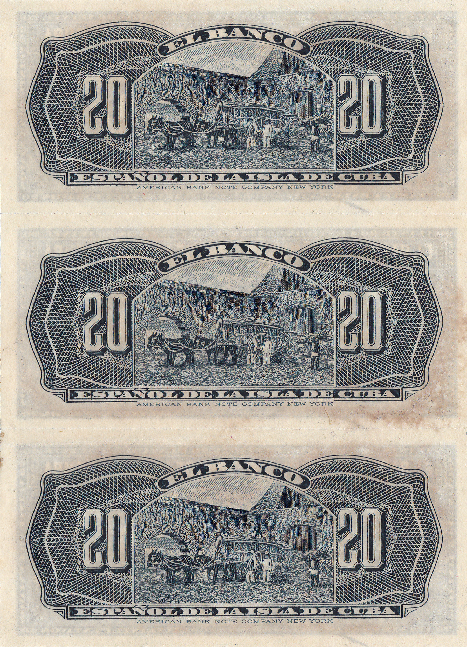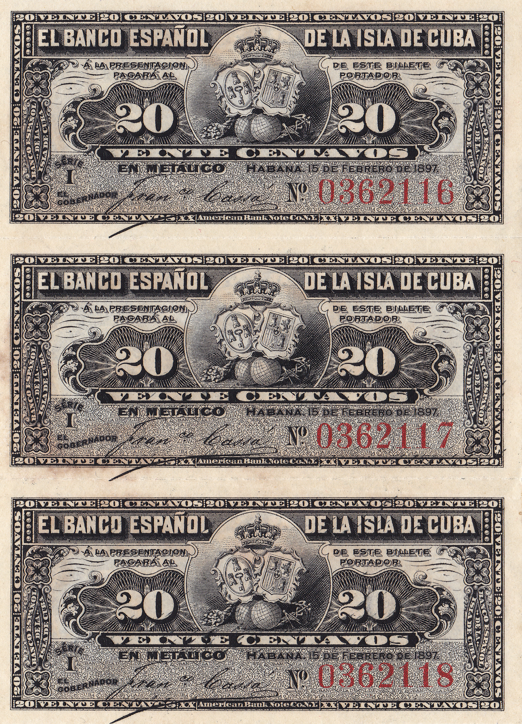 20 Centavos 1897. Pick 54a [# 0362116 t/m 0362118]. 3 x consecutive. Almost UNC.