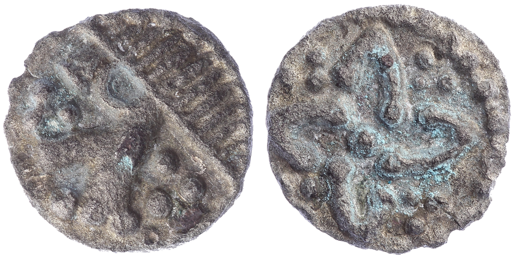 Sceatta z.j. (eind 7e, begin 8e eeuw, voorheen: type Maastricht). Voorzijde portret met diadeem, keerzijde verweven kruis met steeds 3 punten tussen de benen. vdCh. IV-24. Abramson 69; Metcalf 265-6. Zeldzaam (R). Fraai / Zeer fraai. ⁂