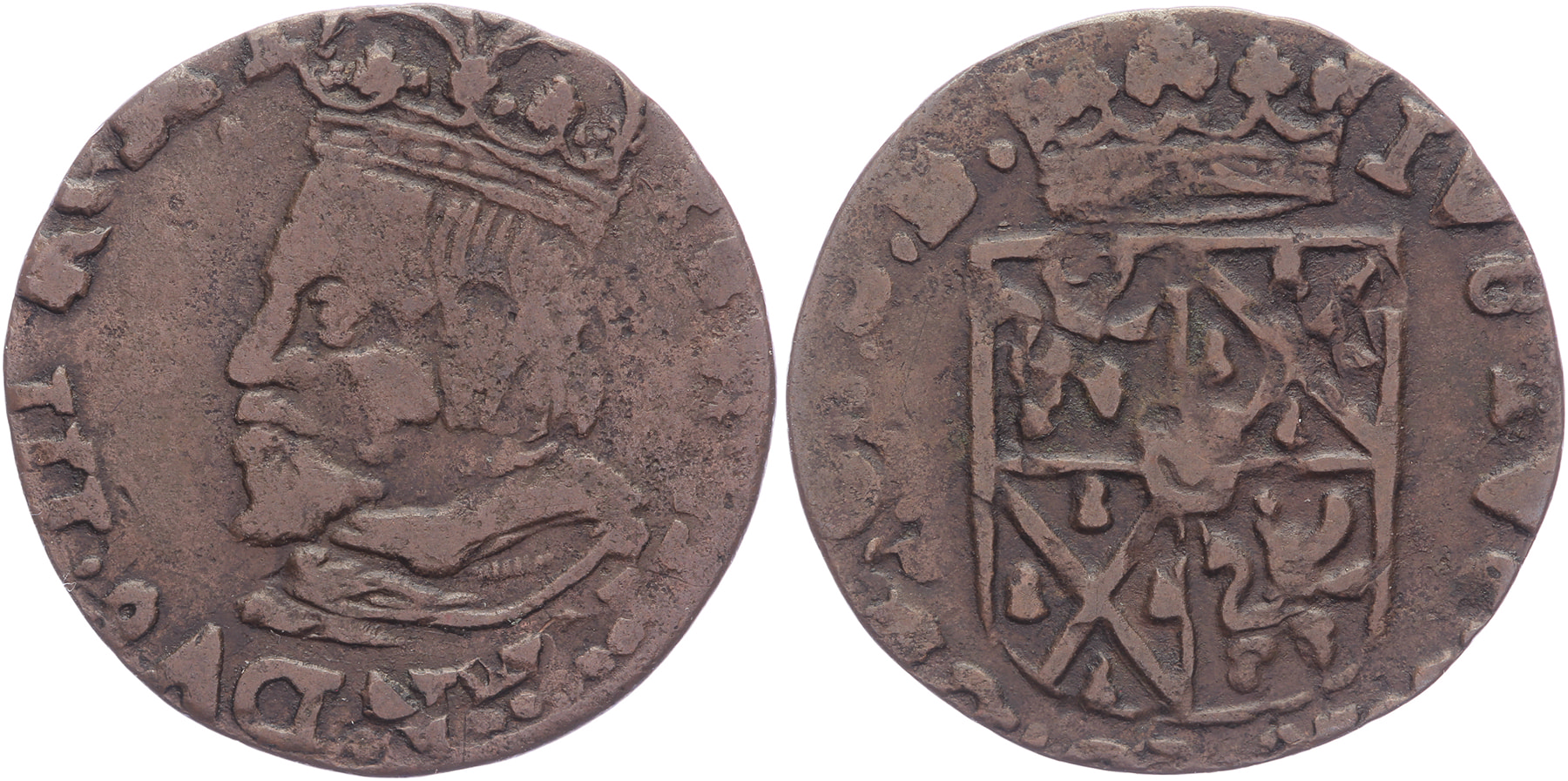 Oord z.j. voorzijde: gekroond portret naar links, keerzijde: gekroond wapen, linksboven en rechtsonder leeuwen naar rechts, rechtsboven en linksonder Batenburg. Lucas 79-var; Van Daalen 48; PW 9115-var; CNM 2.22.56;2.22.57-var. Zeer fraai. ⁂