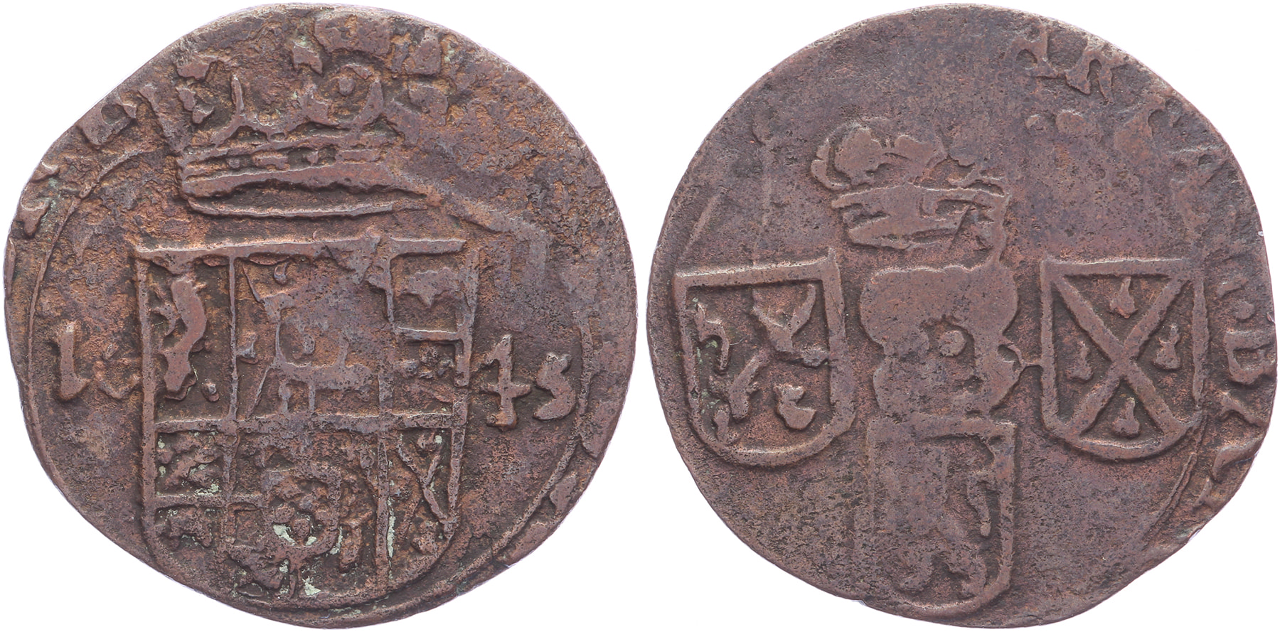 Oord 1645. Geslagen over andere oord? Omschrift voorzijde: .. ARFA ()BAT… Lucas 112-var; Van Daalen 56a-var; PW 9121-var; CNM 2.22.85-var. Zeer zeldzaam (RR). Fraai / Zeer fraai. ⁂