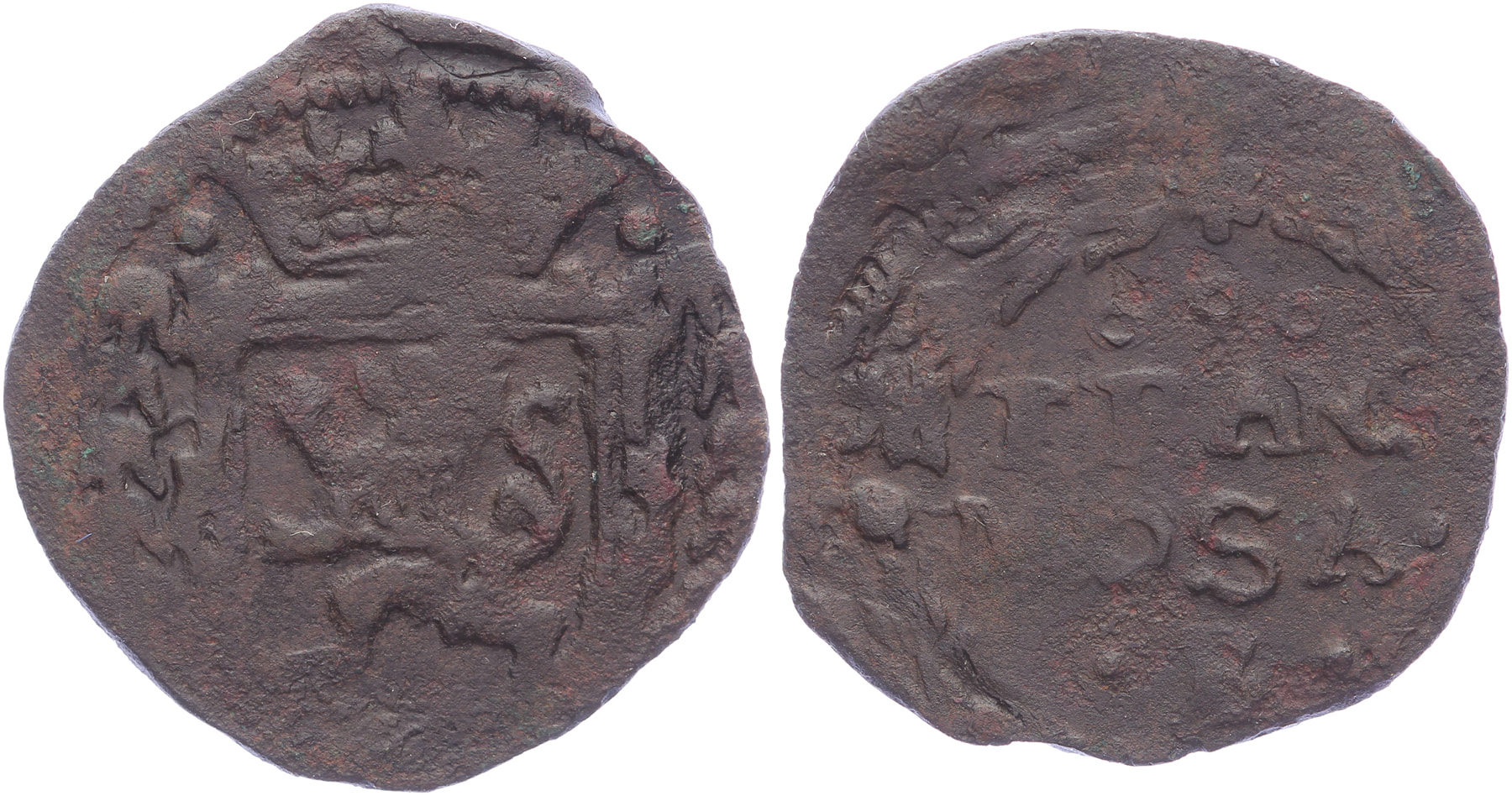 Duit z.j. voorzijde: gekroond wapen van Bronkhorst aan weerszijden en hangende bladertak, keerzijde: tekst in een krans van 4 bladertakken. Lucas -; Van Daalen 53b1; PW 9112.2; CNM 2.22.102-var (3 annuletten ipv punten). Fraai / Zeer fraai. ⁂