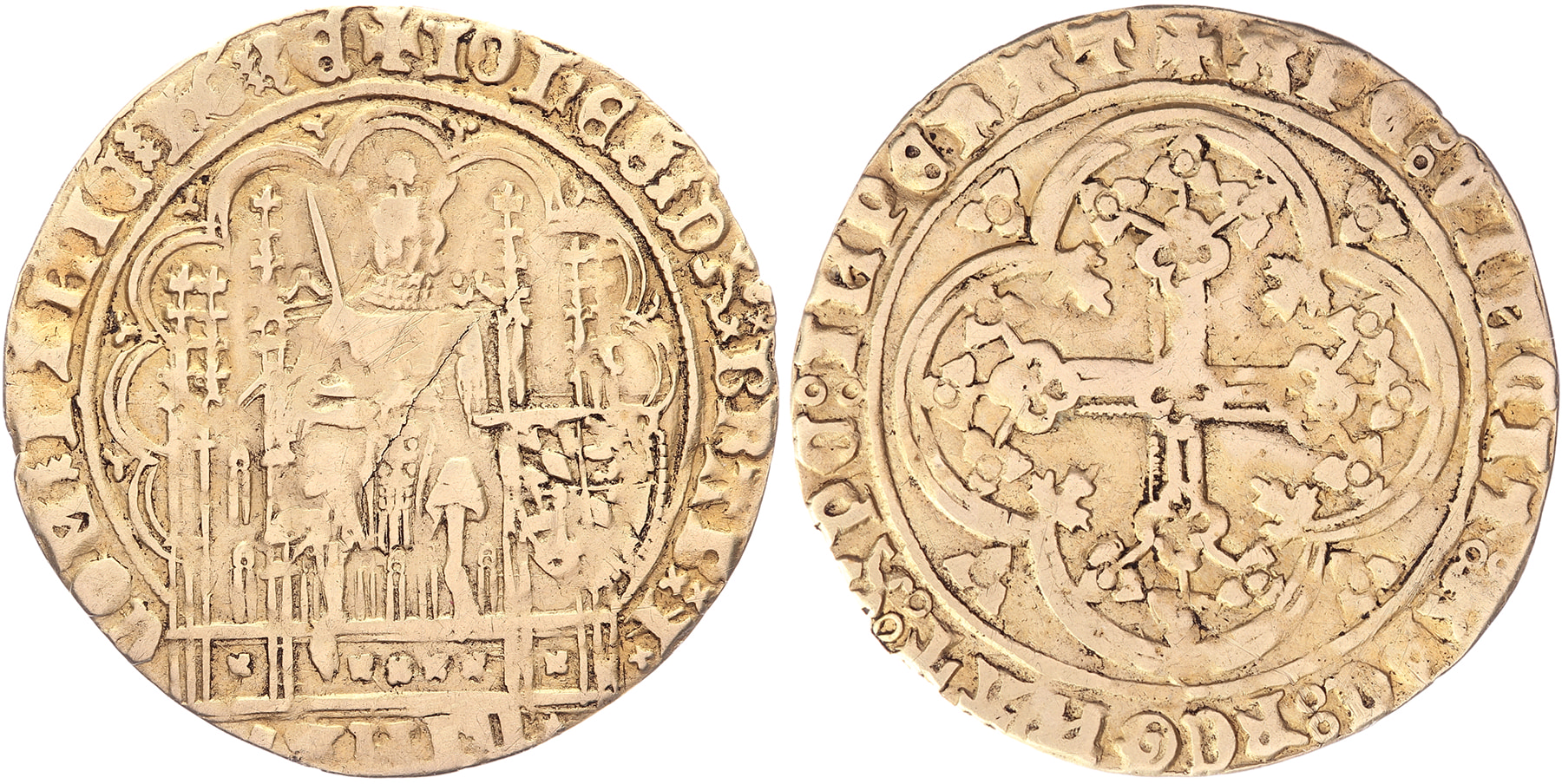 Gouden schild z.j. (1418-1419) [3,40 gram] met wapen en titels van zijn vrouw Jacoba van Beieren. De Witte 441; Delm. 55; Vanhoudt G348. Slechts 19.513 exemplaren geslagen. Zeer zeldzaam (RR). Zeer fraai. ⁂