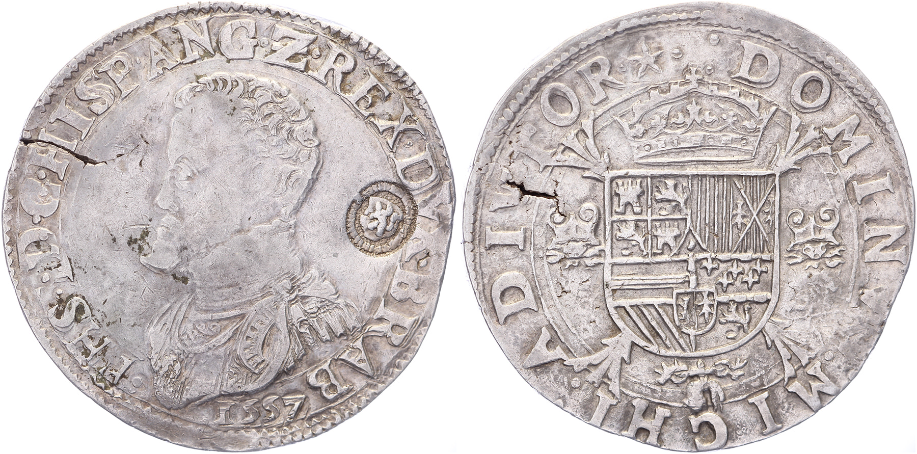Philipsdaalder 1557, met titel van Engeland, borstbeeld naar links, naam afgekort (Phs), muntteken ster op keerzijde. Met klop Holland (1573/1574). GH 210-2c; Delm. 21 (R1); Vanhoudt 253 (R1); CNM 2.07.9. Zeldzaam (R). Barst in muntplaatje. Zeer fraai. ⁂Ex Veiling Sonntag, juli 2020, kavel 113