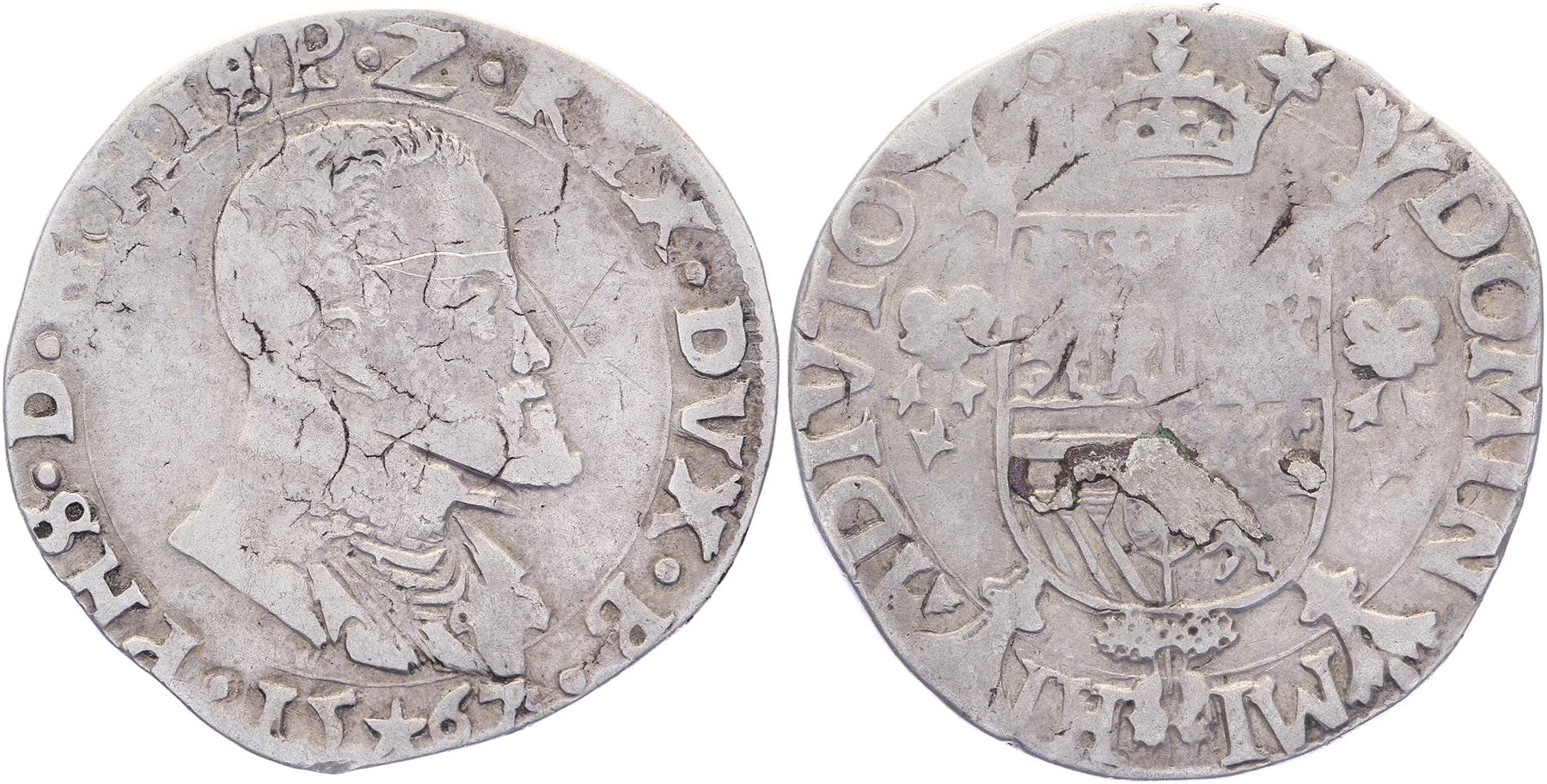 1/5 Philipsdaalder 1567, borstbeeld naar rechts, muntteken ster op voorzijde: 15*67, en op keerzijde. GH 212-2a; Vanhoudt 271 (R1); CNM 2.07.16. Zeldzaam (R). Fraai / Zeer fraai. ⁂