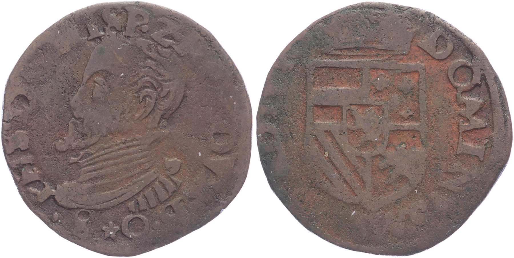 Duit 1580, met afgekort jaartal (8-0), zonder ringetjes. GH 233-2; Vanhoudt 326; PW 9306; CNM 2.07.29. Bijna zeer fraai. ⁂