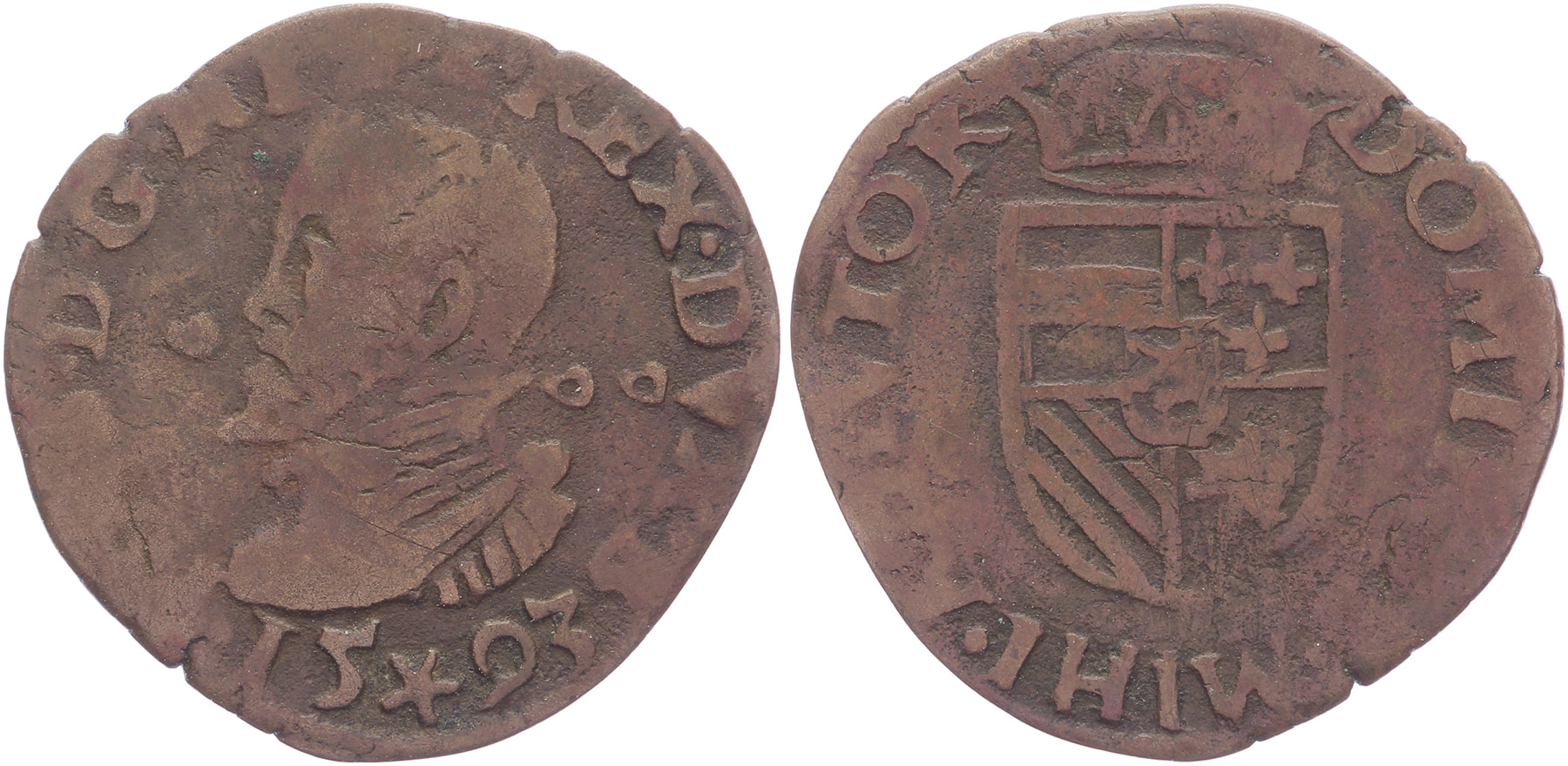 Duit 1593, met volledig jaartal 15-93 en ringetjes naast portret 0-00. GH 233-2; Vanhoudt 326; PW 9306; CNM 2.07.29. Fraai / Zeer fraai. ⁂