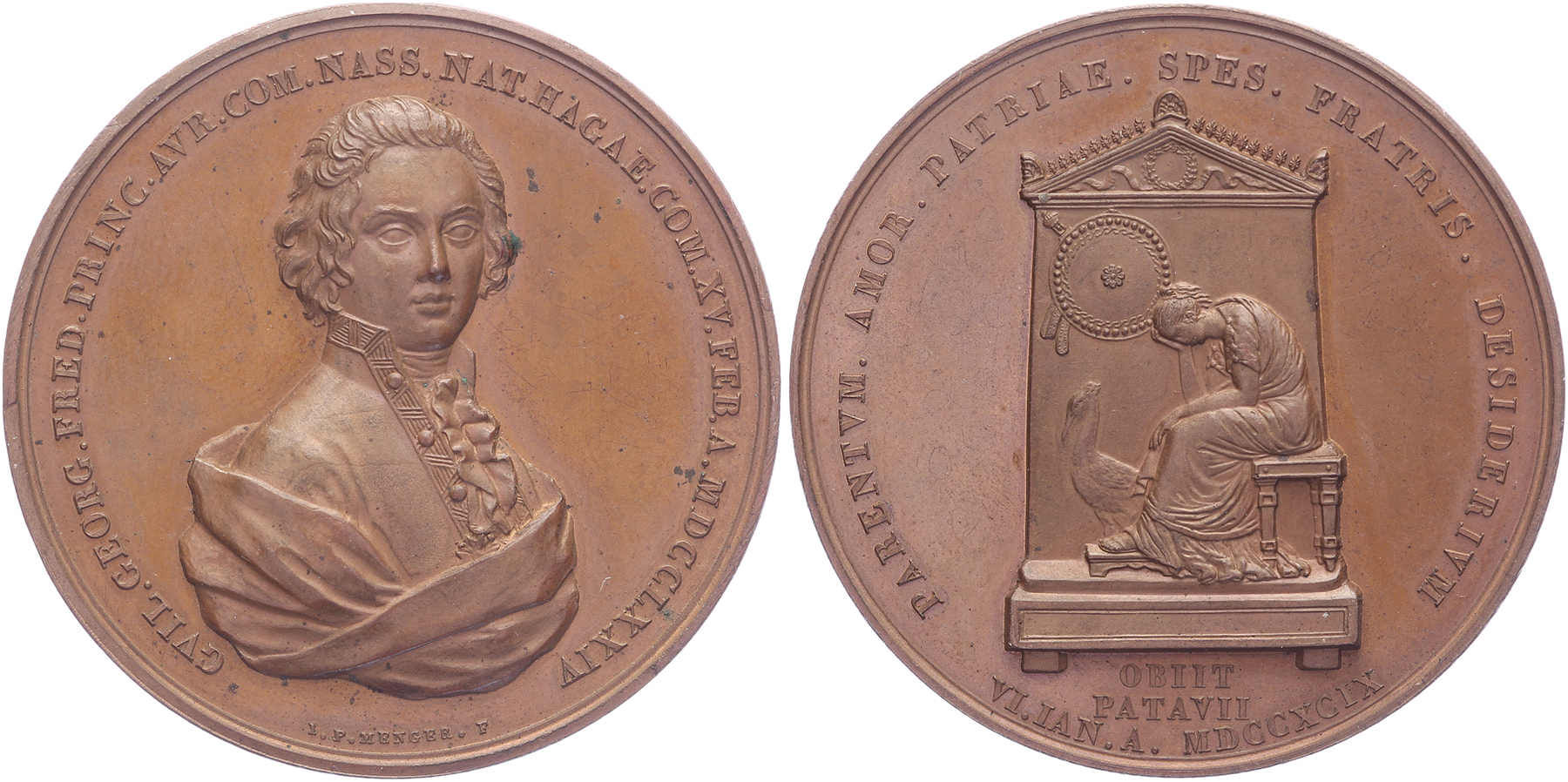 1799 Overlijden Willem George Frederik, prins van Oranje, te Padua. Borstbeeld van de 25-jarige prins in Oostenrijks uniform naar rechts. / Zittende, treurende vrouw. Æ 47. vL 846. J.P. Menger Prachtig / FDC.