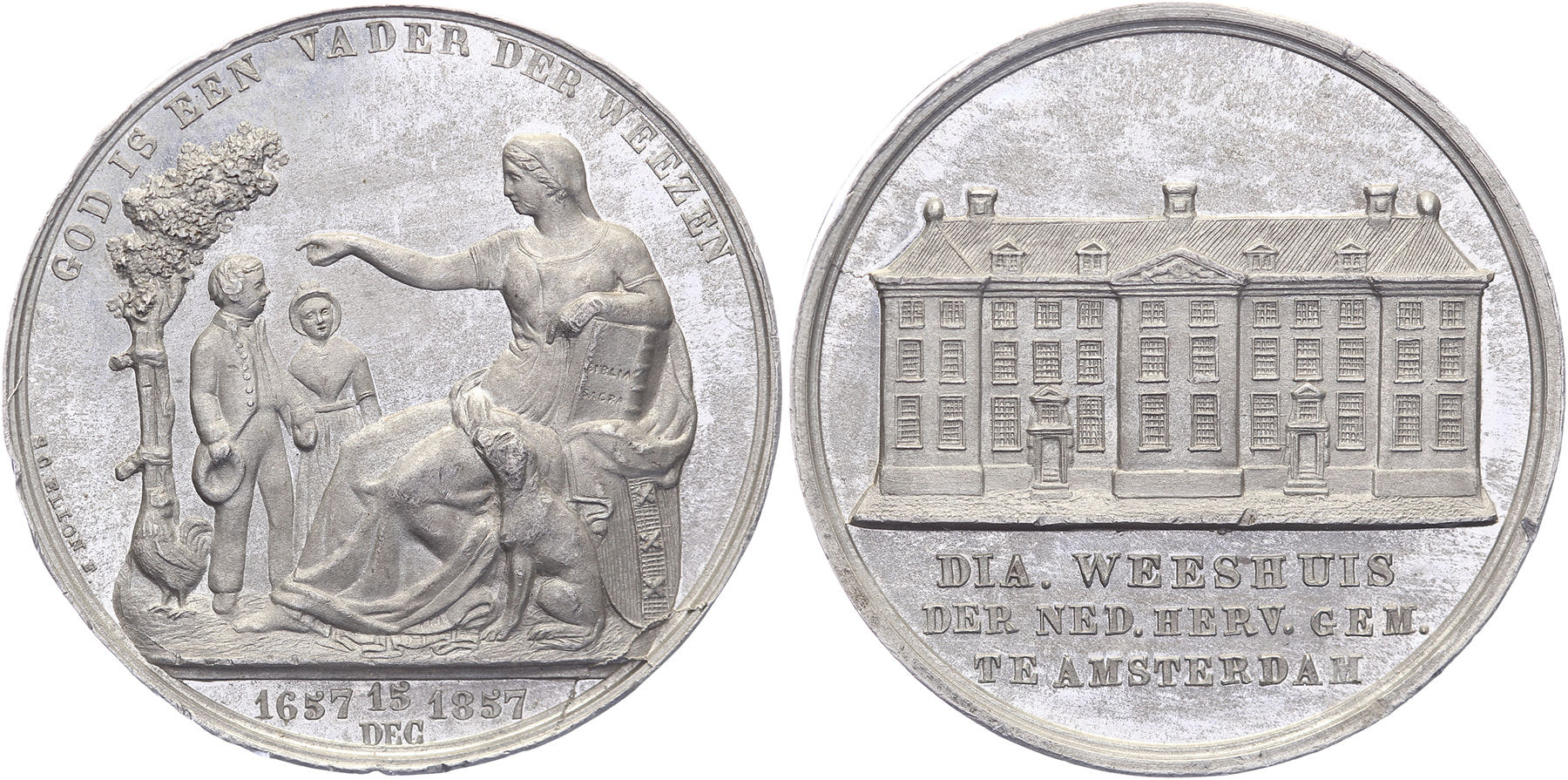 1857 Amsterdam, Diakonie Weeshuis 200 jaar. Gezicht op het weeshuis. / Zittende Liefdadigheid met hond bij weesjongen en weesmeisje. Tin 40,4. Dirks 797. S.C. Elion. Lichte randbeschadigingen. Prachtig.
