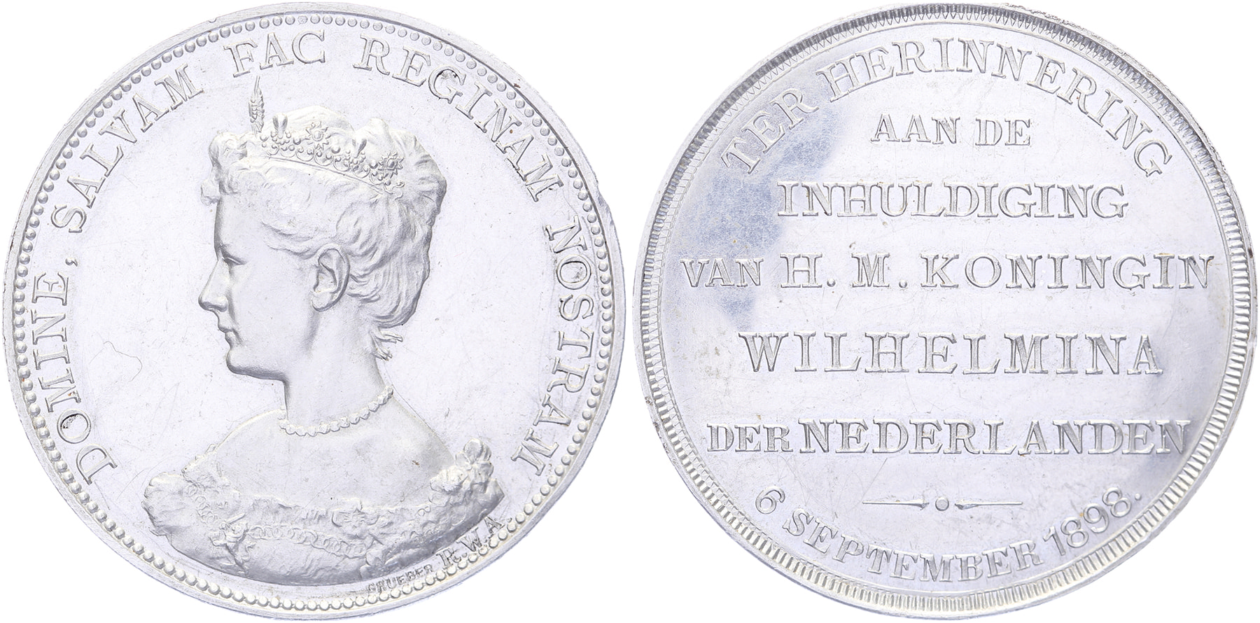 1898 Inhuldiging koningin Wilhelmina. Buste Wilhelmina naar links. / Zevenregelig opschrift. Stevig bordpapier in aluminium omhulsel 38. Steph./Zw. 56. Grueber (London). Tikje rand. Prachtig.