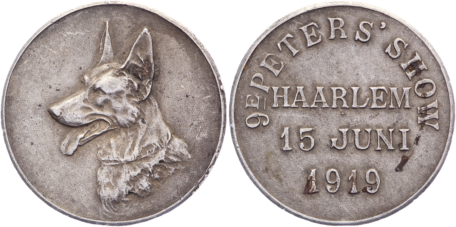1919 Haarlem, 9e Peters’ Show. Kop Duitse herder naar links. / Op- en omschrift. AR 25,7 [7,2 gram]. Zeer fraai.