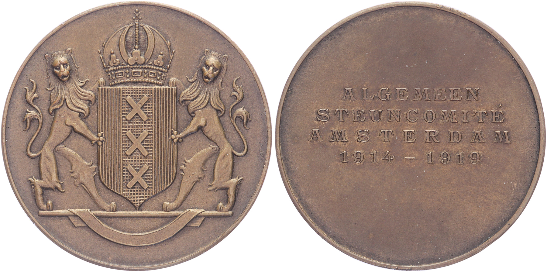 (1922) Algemeen Steuncomité Amsterdam. Stadswapen van Amsterdam geflankeerd door twee leeuwen. / Vierregelige tekst. Æ 35 mm. KB II-214. D. Scholtus. Prachtig.N.B. Aangeboden aan de leden van de Commissie, uitgereikt op 15 februari 1922.