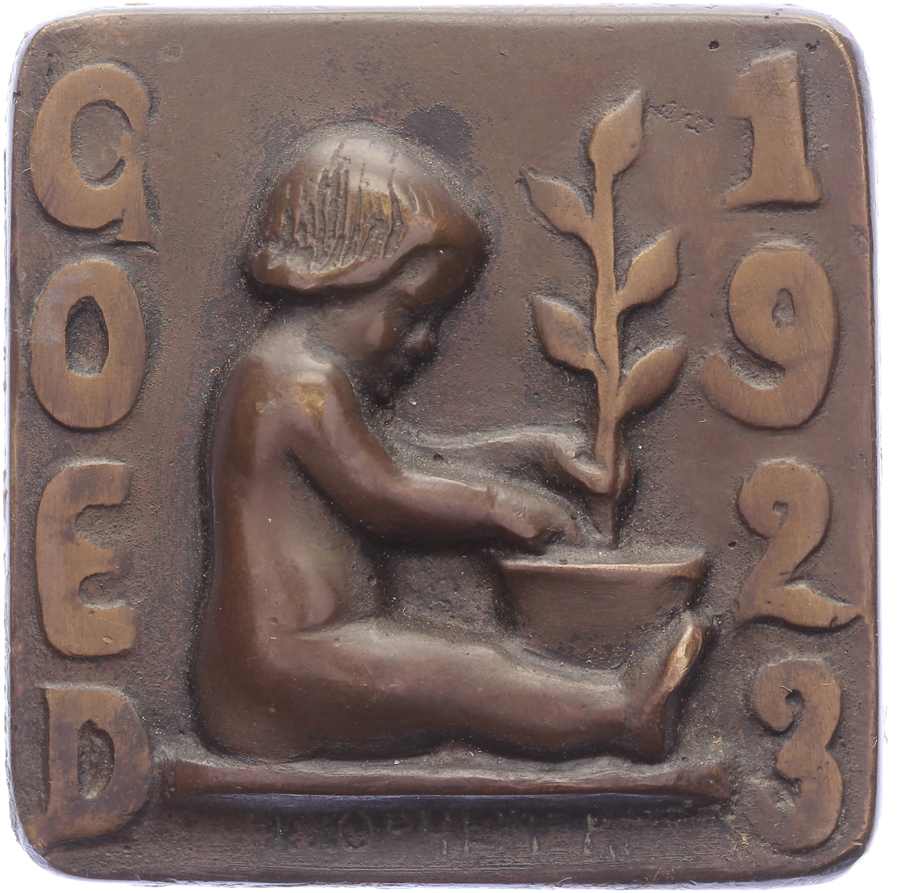 1923 Kindje met plant. Zittende peuter bij pot met plant. / Blanco.Æ 46 x 47. H. van Ophemert. Mogelijk onderdeel geweest van een presse-papier. Prachtig.