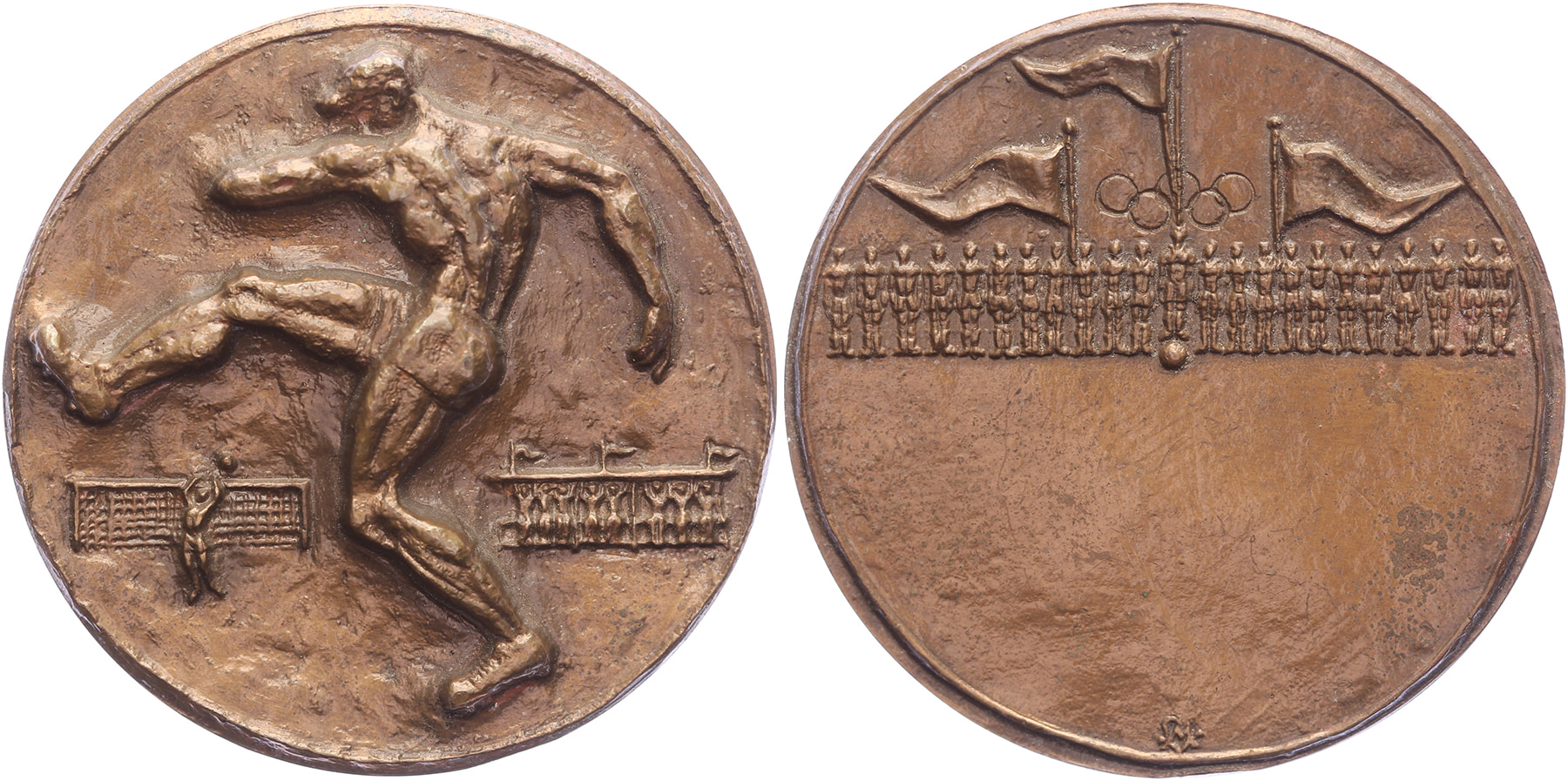 (1957) Prijspenning voetbal Olympische Spelen. Voetballer in actie. / Inscriptieruimte onder rij voetballers met vlaggen en Olympische ringen. Æ gegoten 50. De Beeldenaar 1998, pag. 128, nr. 17. Niet vaak voorkomend. Loeki Metz. Prachtig.
