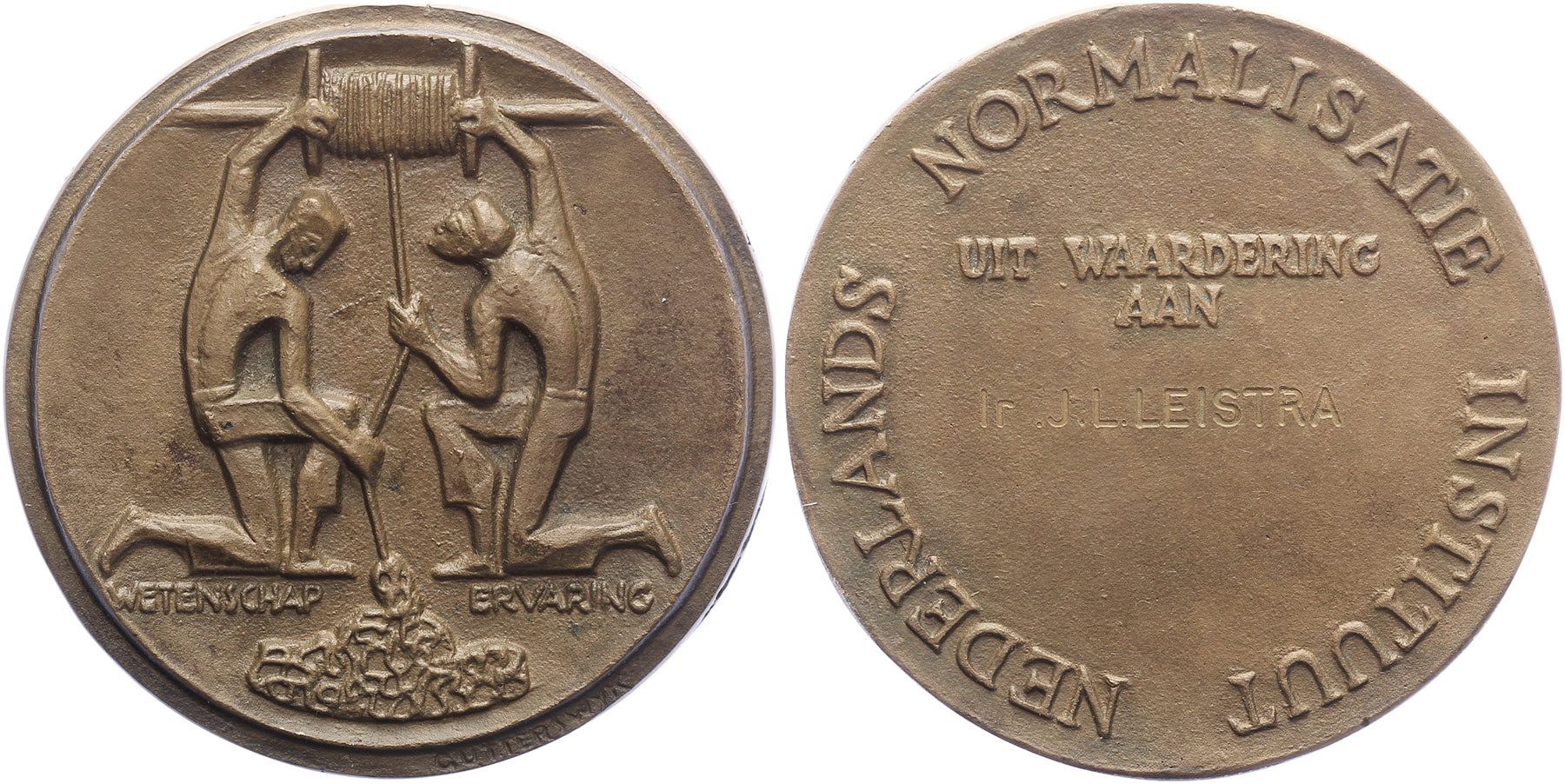 (1960) Erepenning Nederlands Normalisatie Instituut. Twee knielende figuren trekken aan koord op katrol. / Inscriptieruimte binnen omschrift. Op naam gesteld. Æ gegoten 78. KB V-2602. J.B. Gutterswijk. Prachtig.
