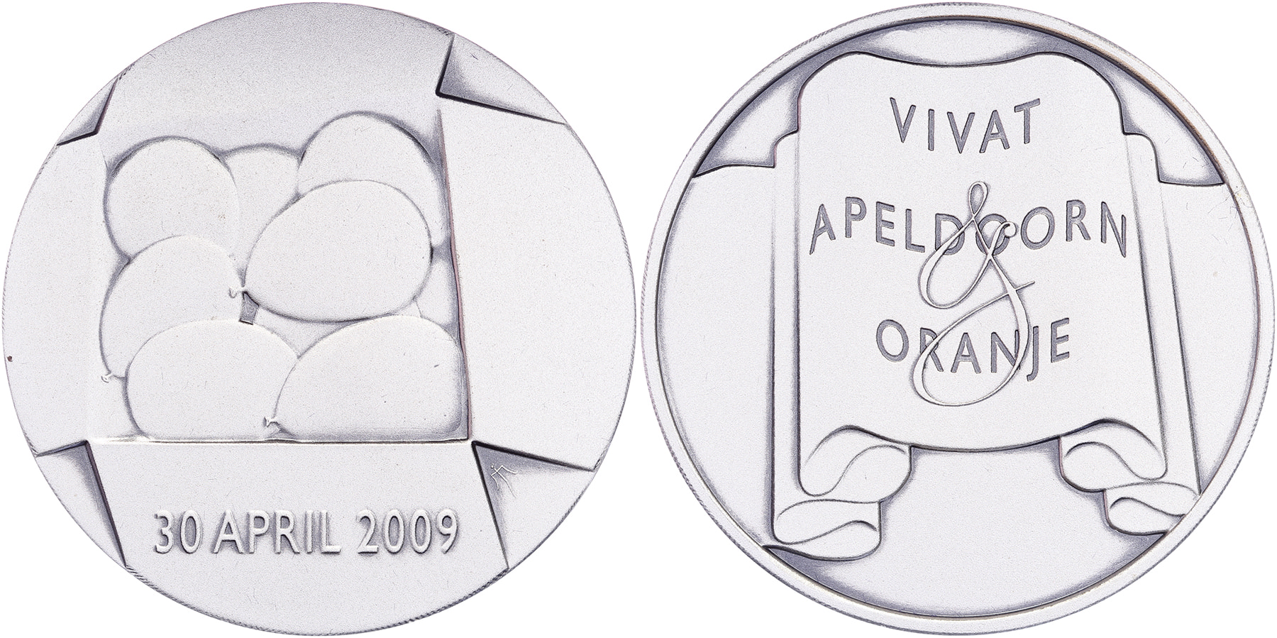 2009 Apeldoorn, koninginnedag. Onuitgepakte doos met balonnen. / Vlag waarop: VIVAT APELDOORN ORANJE. Æ verzilverd 50. Menno Jonker. Vervaardigd bij de KNM. FDC.