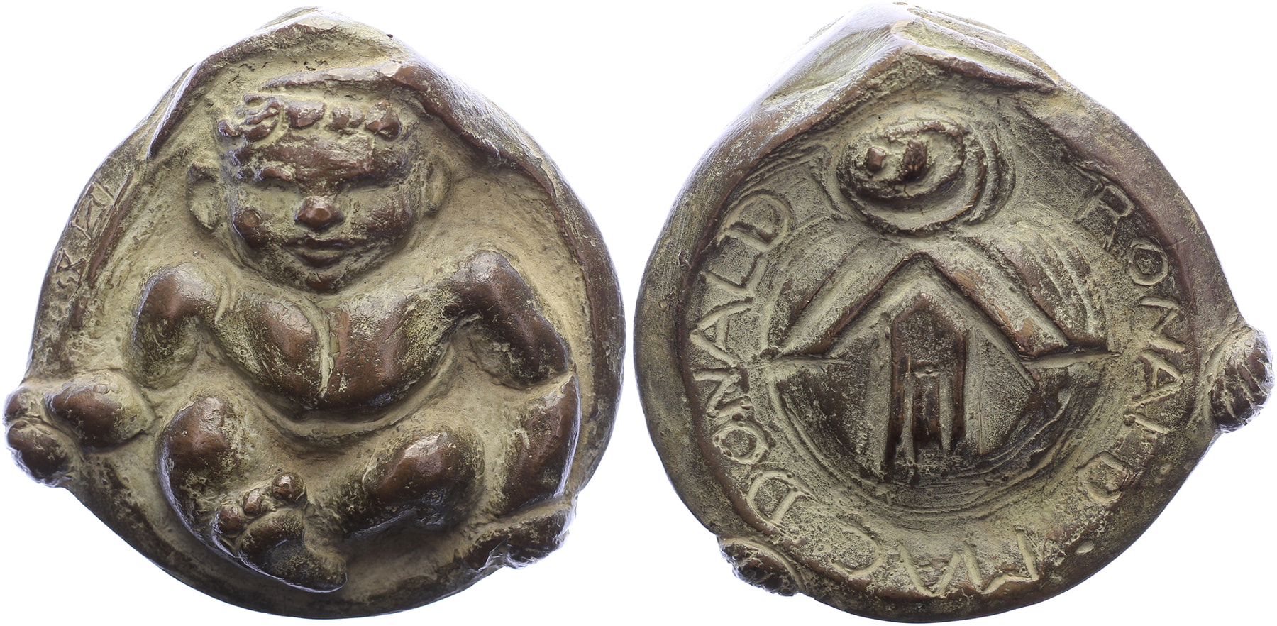 z.j. Ronald McDonaldhuis. Zittende peuter. / Huisje.Æ gegoten, onrond, ca. 85 mm. Tineke Bot (1945 -). Prachtig.