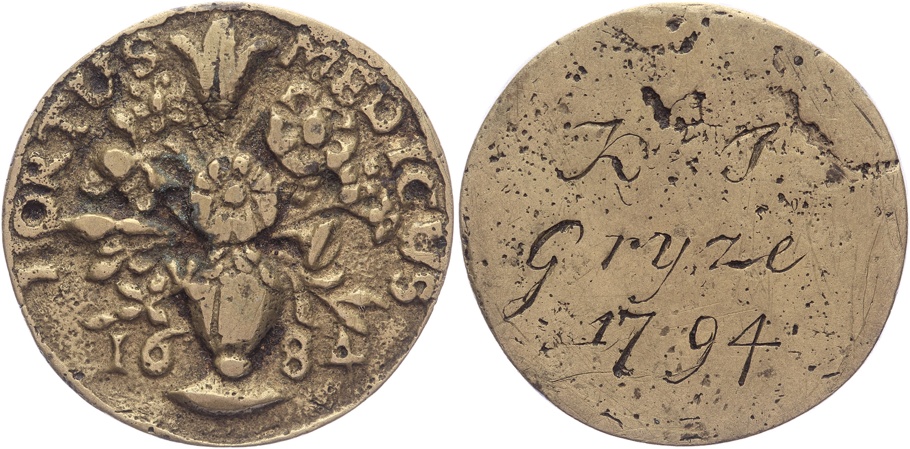 1684 Toegangspenning leerlingen Hortus Medicus. Vaas met bloemen. / Glad, gegraveerd K.J. Gryze 1794. Geelkoper gegoten 29,4. WK 30.4; Dirks I-3. Ruim fraai.