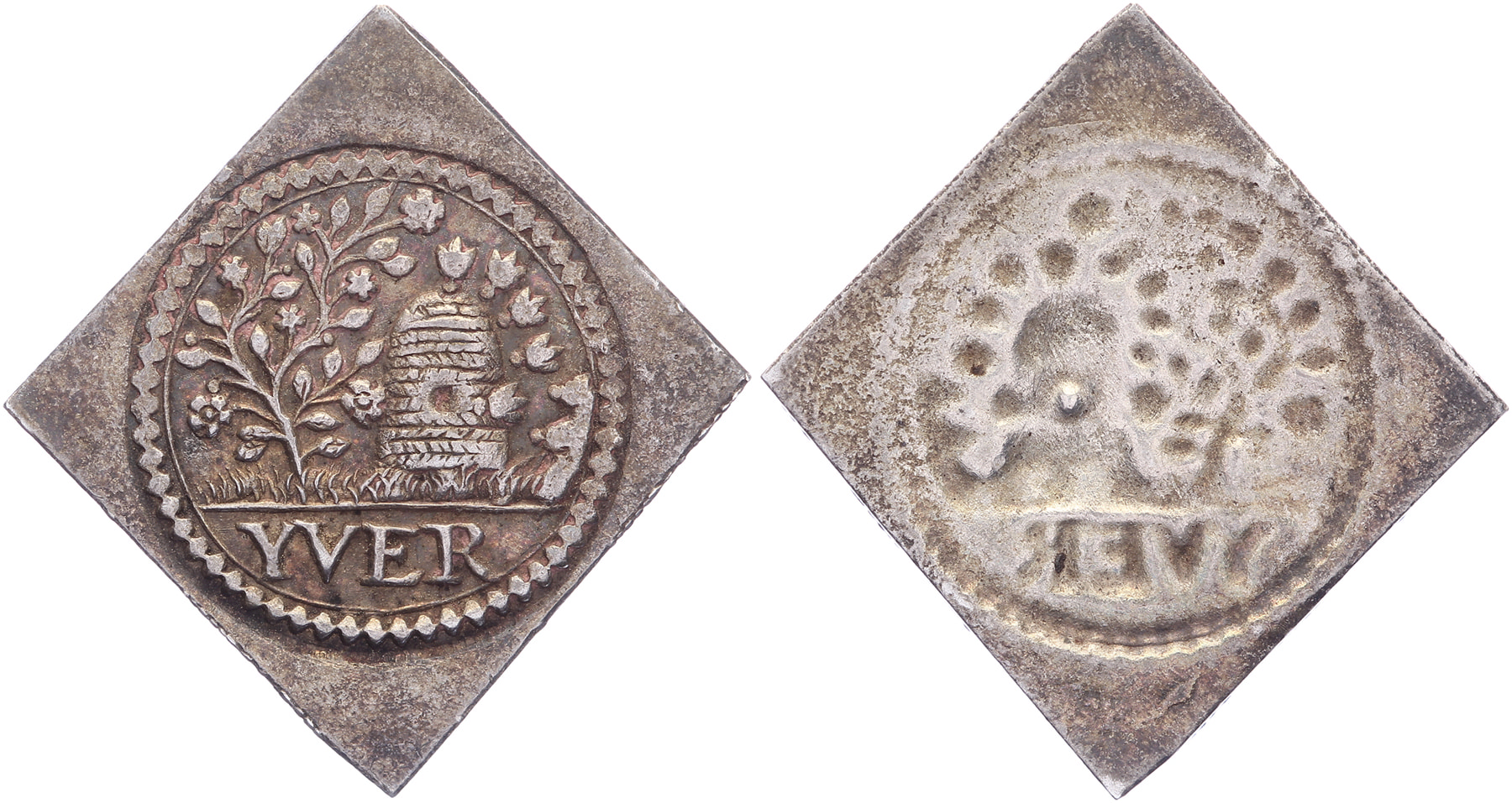 z.j. Toegangspenning Rederijkerskamer De Egelantier. Bijenkorf en boom boven YVER. / Blanco.AR 24 x 24 [1,52 gram]. Minard 86. Ruim zeer fraai.