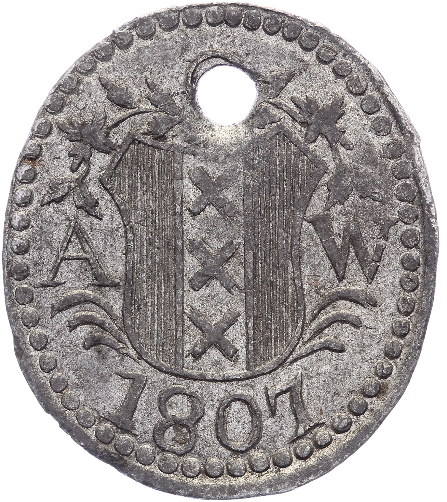 1807 Hondenbelastingpenning (A’dams Weeshuis). Lood, ovaal 28,6 x 24. Kooij 0120. Prachtig.
