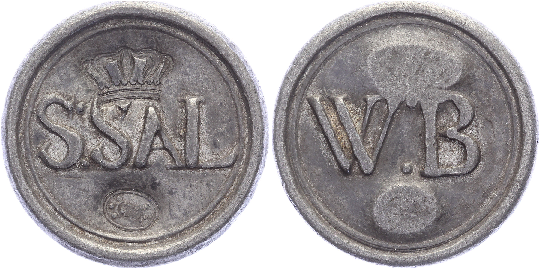 z.j. Armenpenning St. Salvator. S SAL onder geklopte kroon en wapenschild. / Opschrift W.B (wijk B).Lood gegoten 36. Minard 190. Prachtig.