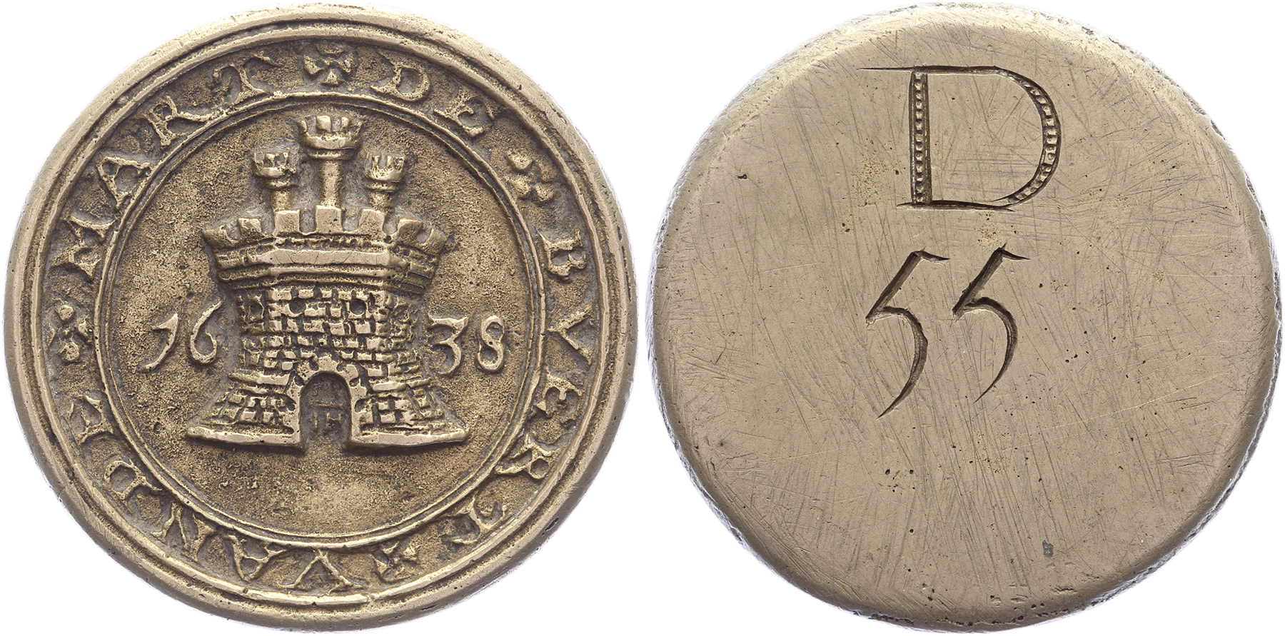 1638 Buurtpenning Dagelijkse Groenmarkt. Kasteel met drie torens tussen jaartal. / Glad; ingegra-veerd: D55. Messing gegoten 40,9. vRem 2; Minard 212. Ruim zeer fraai.